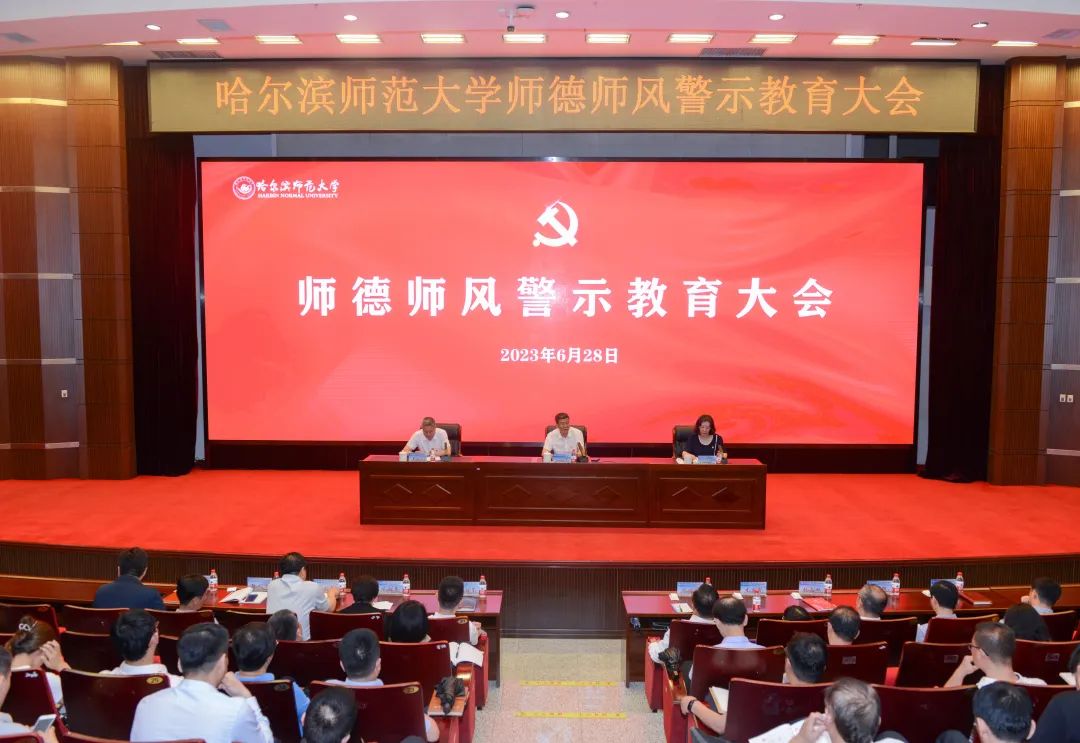 (曹傲然/文)学校党委教师工作委员会成立以来,始终将师德师风建设抓在手里,为切实加强党对教育工作的全面领导,充分发挥反面典型案例的教育、警示、震慑作用,6月28日,经党委办公室、纪委办公室的积极筹备,哈尔滨师范大学师德师风警示教育大会在科学会堂二楼报告厅举行。学校党政领导班子成员出席会议。省委主题教育第十七巡回指导组副组长闫国荣、成员郑国玺受邀出席。会议由党委副书记、工会主席郭砾主持。