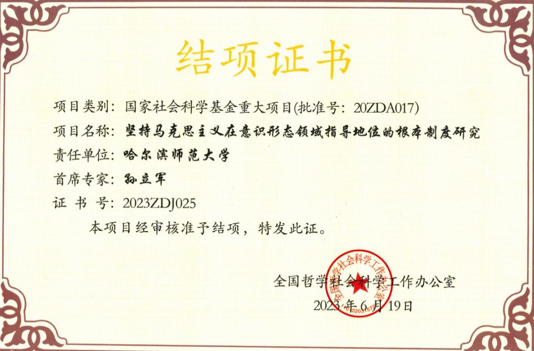 (赵德鸿/文)近日,我校孙立军教授主持的国家社会科学基金重大项目“坚持马克思主义在意识形态领域指导地位的根本制度研究”(项目编号:20ZDA017)顺利通过结题(结项证书号:2023ZDJ025),也是我校首个结题的国家社科基金重大项目,该项目主要合作单位为东北农业大学。