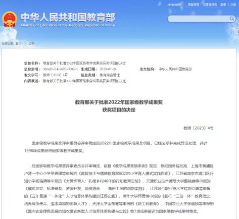 这是继2014年斯拉夫语学院教学团队获得高等教育(本科)国家级教学成果奖,时隔8年后,再次获得国家级教学成果奖,也是我省高等学校首次获得基础教育国家级教学成果奖。