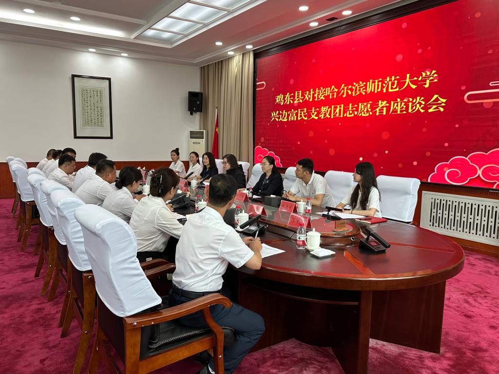 (刘国英/文)8月9日,我校鸡东县兴边富民支教团志愿者座谈会在鸡东县会议中心召开。鸡西市委副书记、鸡东县委书记苑芳江,校党委副书记、工会主席郭砾出席座谈会并讲话。鸡东县相关领导,县教育局、团县委、第二中学、第五中学,我校相关部门负责同志、辅导员代表、鸡东县支教团成员参加座谈会。会议由鸡东县委副书记高占昆主持。