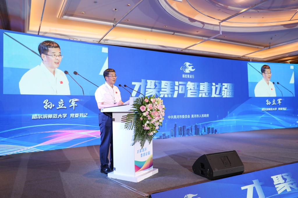 孙立军在会议上作主题发言。他表示,学校与黑河市在产学研等领域有着较为深厚的合作基础。近年来,学校深入贯彻落实国家和我省教育向北开放战略部署,深度融入共建“一带一路”,积极参与“中蒙俄经济走廊”建设,蓄力构筑教育向北开放新高地,充分发挥人才、智力优势,积极开展校地合作交流,成效显著。他指出,黑河市地处东北亚经济圈核心地带,是“一带一路”与欧亚经济联盟对接的重要板块,区位、资源、文化、生态优势明显,发展空间广阔。希望能够以本次活动为契机,与黑河市在以下三个方面继续深化合作:一是以G-U-S教师教育联盟为平台,发挥学校教师教育优势,与黑河市基础教育开展深度合作,助力黑河市基础教育改革和师资队伍建设。二是以教育向北开放为契机,聚焦中俄教育及其他相关领域,将学校对俄高端智库和艺术类学科人才优势与黑河市的对俄区位优势深度融合,共谋向北开放大计。三是以创意设计产业为载体,发挥学校创意设计学科专业人才优势,为黑河市文旅产业、冰雪产业以及传统产业赋能,助力黑河市产业升级,推动黑河市由“黑河制造”向“黑河创造”跃升。