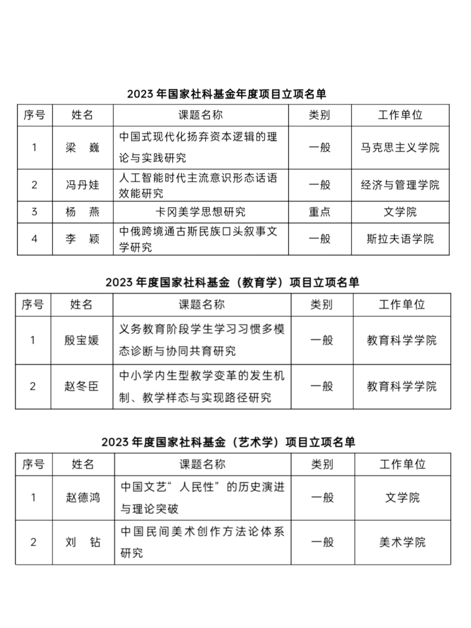 截至目前,2023年国家社科基金年度项目、青年项目、教育学项目、艺术学项目均已公示。我校共获得2023年度国家社科基金项目8项,其中重点项目1项,一般项目3项,教育学项目2项,艺术学项目2项。