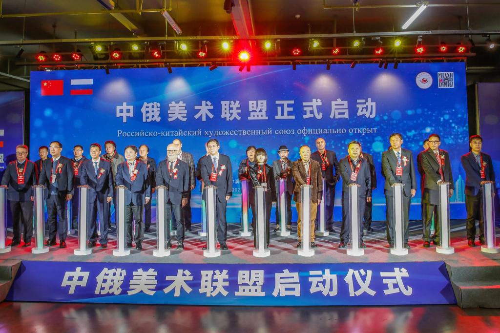接着,在与会代表和在场师生的共同见证下,中俄美术联盟各方代表共同上台,触摸启动按钮,点亮象征联盟宗旨“自愿、平等、合作、共赢”的光柱,正式启动中俄美术联盟。