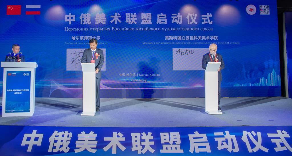 联盟牵头单位哈尔滨师范大学校长蒋鲲、俄罗斯莫斯科国立苏里科夫美术学院院长阿纳托利·柳巴温代表中俄美术联盟高校签署合作协议,共同开启中俄美术联盟美好未来。