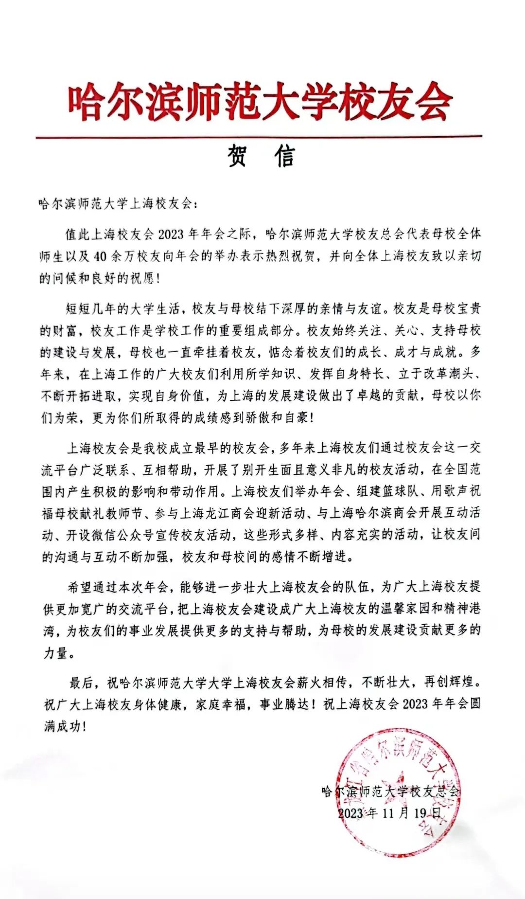 学校党委书记孙立军对上海校友会多年来取得的成绩给予高度评价,并为本次年会录制庆贺视频。他指出,哈师大上海校友会成立的十三年间,身处上海的哈师大学子凝心聚力、开拓进取,在不同历史时期始终与母校同频共振,反哺母校,为学校各项事业发展作出了卓越贡献。他强调,校友是母校最好的名片,母校则是校友最鲜明的标签。校友会作为母校联系校友的桥梁和纽带,要积极发挥校友的组织作用、领导作用,促进学校与校友逐步形成“感情共同体”“价值共同体”和“命运共同体”。希望上海校友会能够以年会为契机,进一步深化学校与校友间的合作,打造全员参与的工作机制,构筑全心服务的保障体系,拓展全面有效的沟通渠道,凝心聚力、互帮互助,实现学校与校友发展共进共享、共赢共荣。