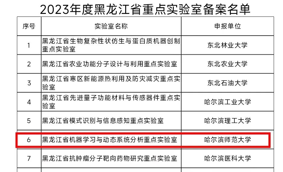 (解瑞峰/文)近日,黑龙江省科技厅公布2023年度黑龙江省重点实验室备案名单,我校数学科学学院申报的“黑龙江省机器学习与动态系统分析重点实验室”获批省级重点实验室,实现我校科研平台建设新突破。截至目前,我校黑龙江省重点实验室增加至7个。