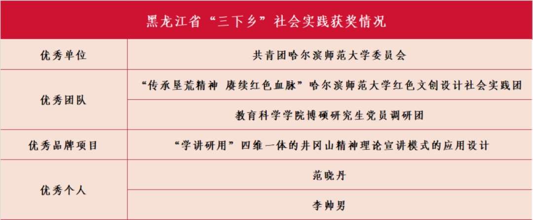在省级评选中,共青团哈尔滨师范大学委员会获评2023年黑龙江省“三下乡”社会实践优秀单位;“传承垦荒精神 赓续红色血脉”哈尔滨师范大学红色文创设计社会实践团和教育科学学院博硕研究生党员调研团获评2023年黑龙江省“三下乡”社会实践优秀团队;“学讲研用”四维一体的井冈山精神理论宣讲模式的应用设计项目获评2023年黑龙江省“三下乡”社会实践优秀品牌项目;教育科学学院党委副书记范晓丹、马克思主义学院团委副书记李帅男获评2023年黑龙江省“三下乡”社会实践优秀个人。