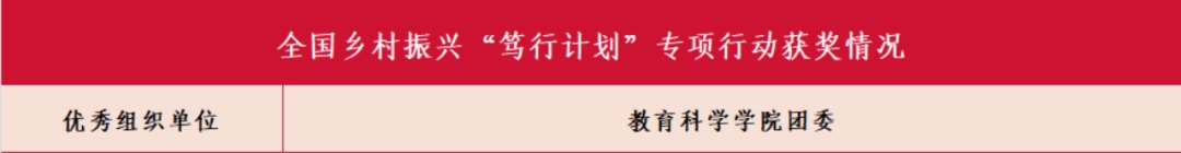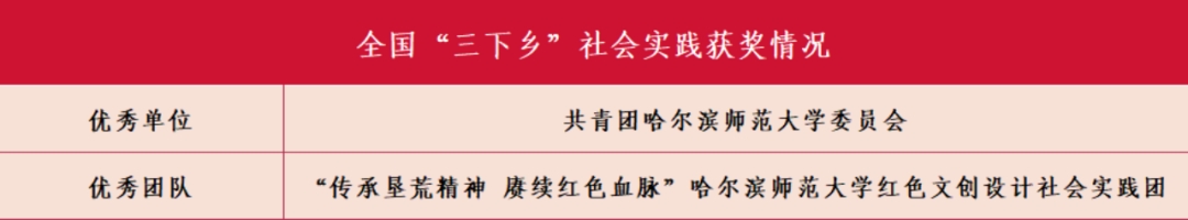 在国家级评选中,共青团哈尔滨师范大学委员会获评2023年全国“三下乡”社会实践优秀单位;“传承垦荒精神 赓续红色血脉”哈尔滨师范大学红色文创设计社会实践团获评2023年全国“三下乡”社会实践优秀团队;教育科学学院团委获评2023年全国乡村振兴“笃行计划”优秀组织单位。