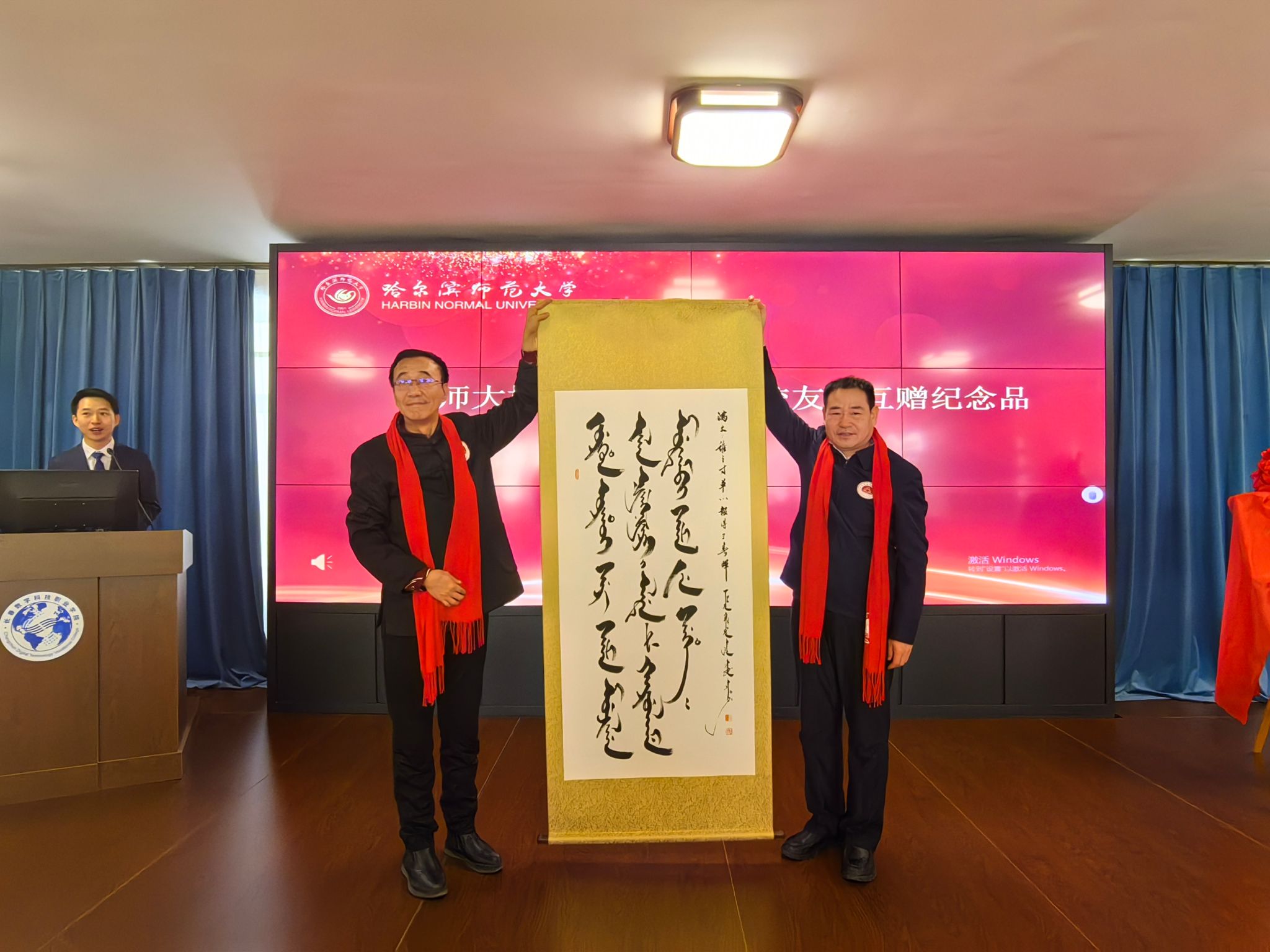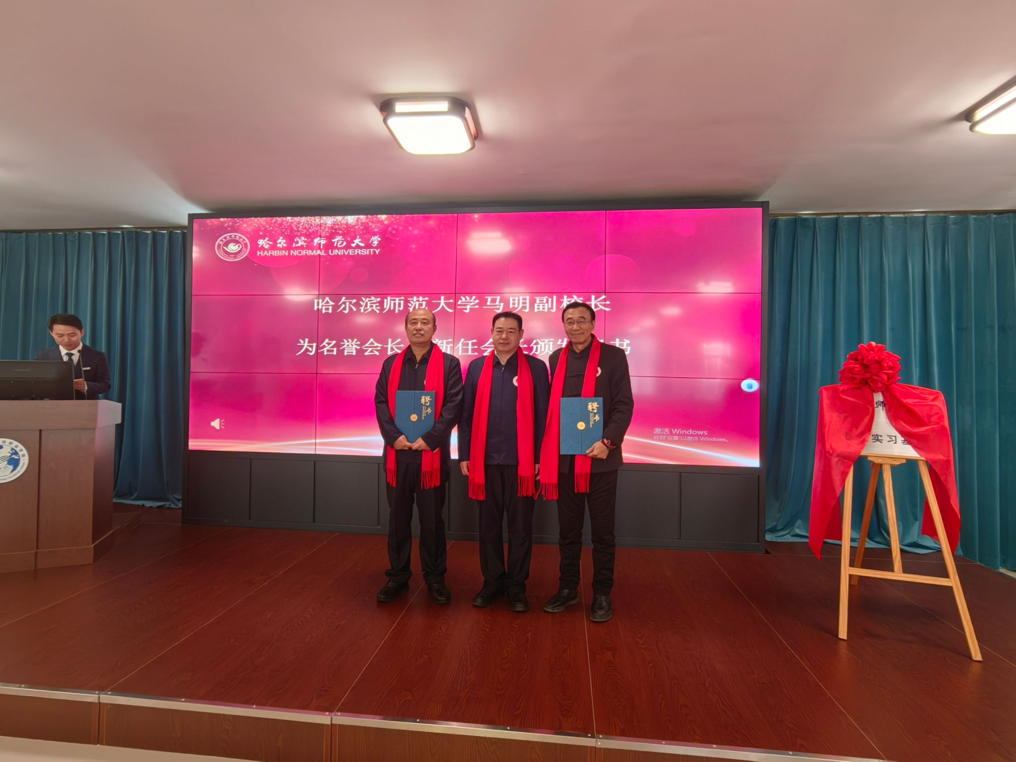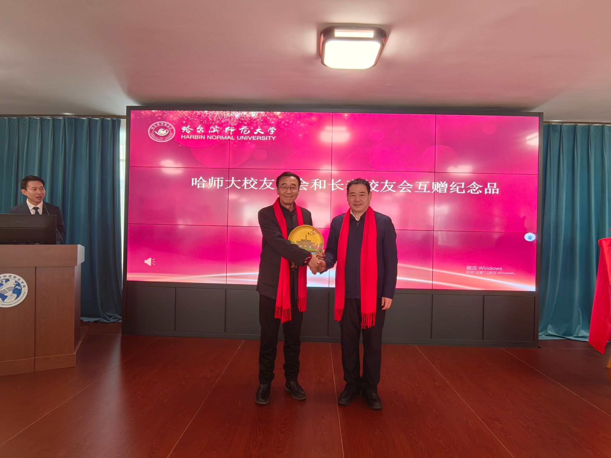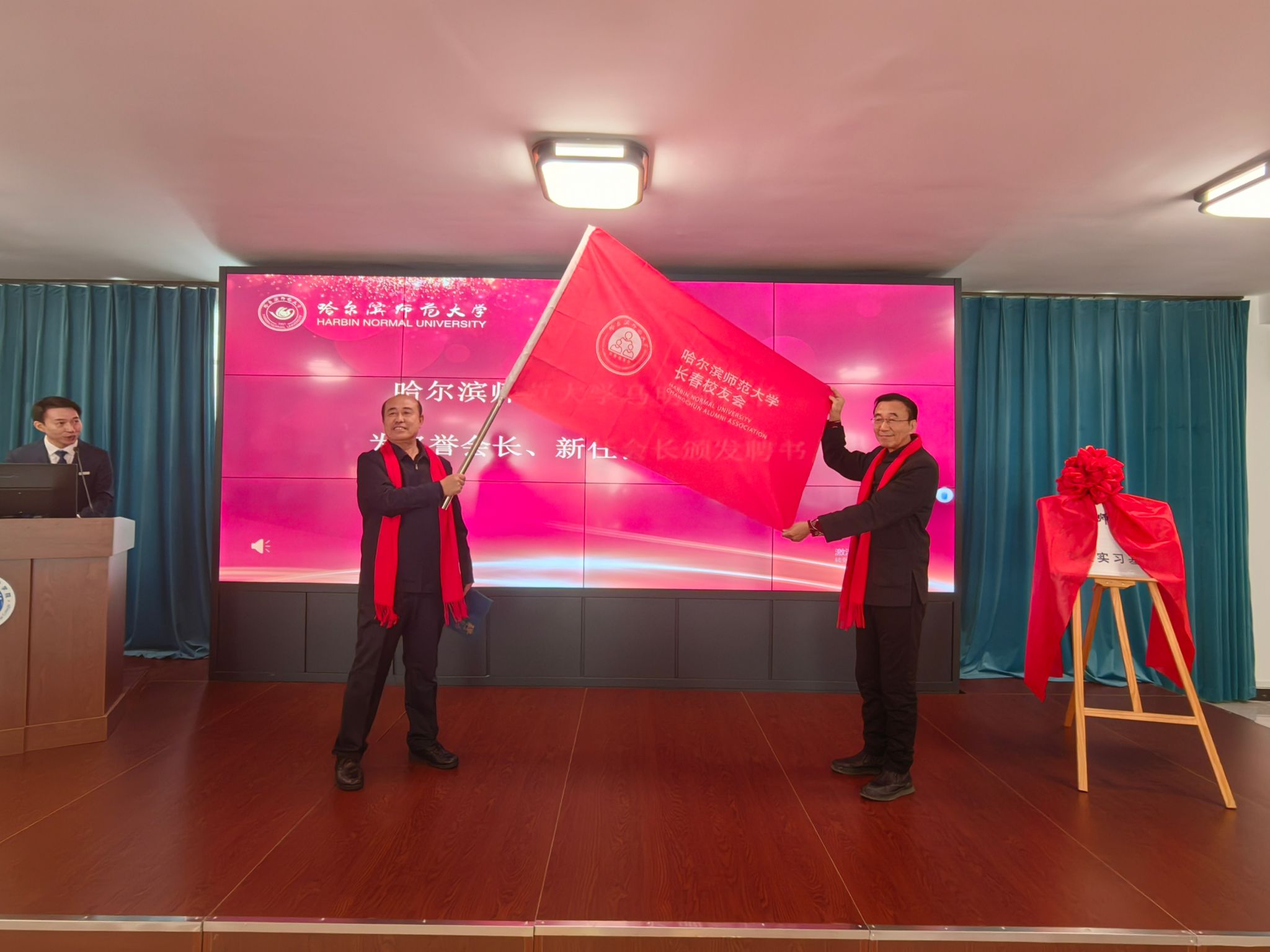 马明为名誉会长、会长颁发聘书,并代表学校与长春校友会互赠纪念品。赫坚与朱立春进行了会旗交接仪式。