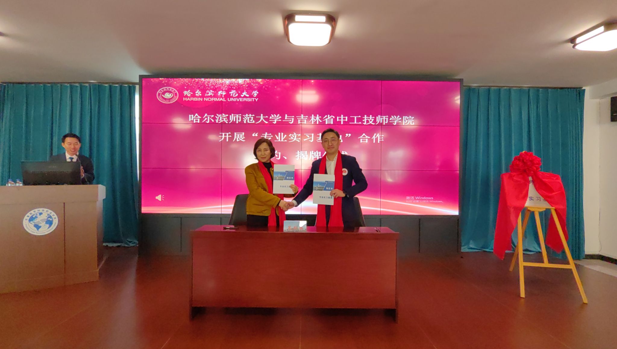 走访期间,两校举行“专业实习”合作签约仪式。马明与闻姝清共同为专业实习基地揭牌。我校教务处副处长马静岩与吉林省中工技师学院代表签订《哈尔滨师范大学专业实习基地协议书》。