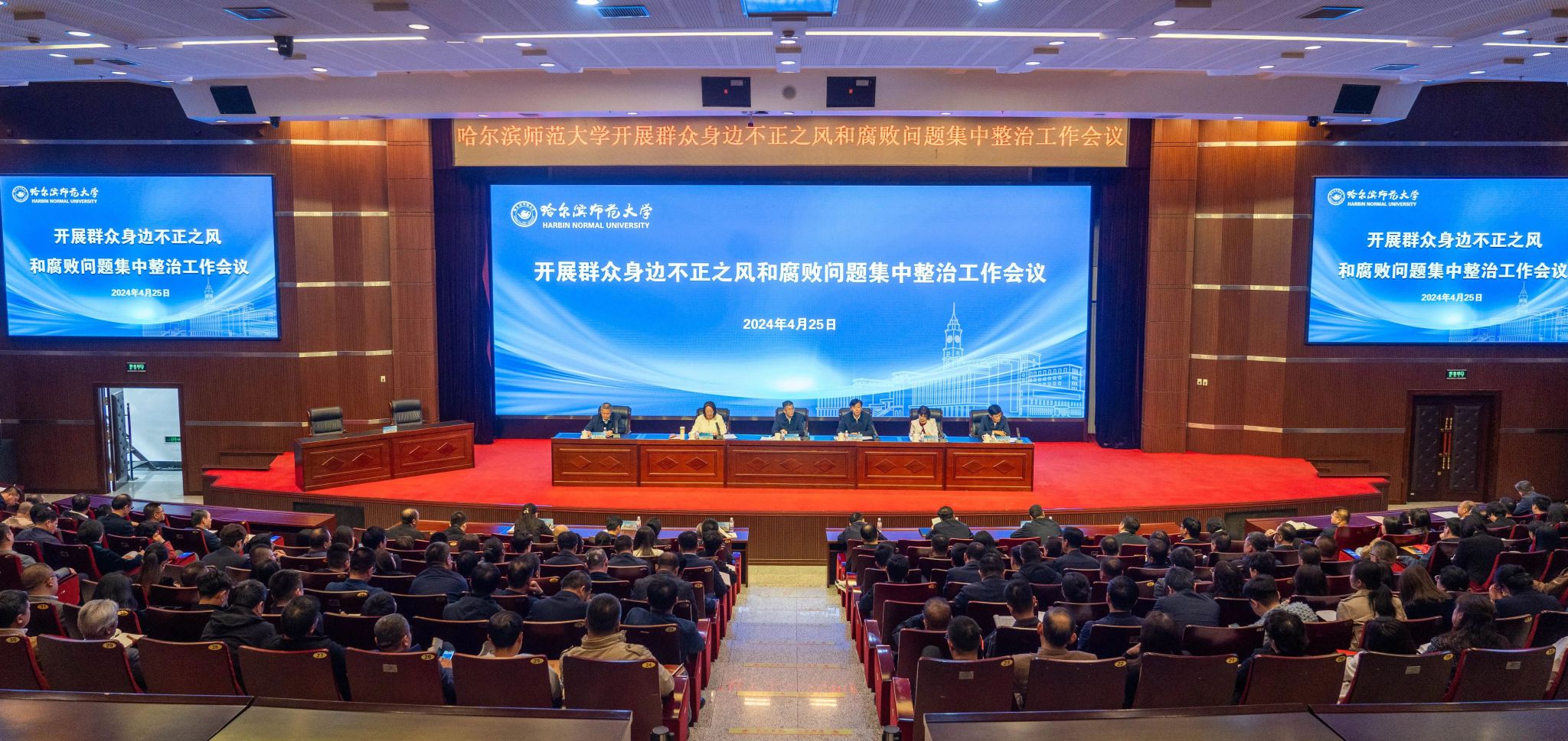 会上,党委副书记、工会主席郭砾传达了中纪委国家监委关于开展群众身边不正之风和腐败问题集中整治相关会议精神;党委常委、纪委书记、省监委驻校监察专员姜国庆传达了省纪委监委召开的关于开展群众身边不正之风和腐败问题集中整治相关会议精神;党委副书记李庆霞对《哈尔滨师范大学关于开展群众身边不正之风和腐败问题集中整治的工作方案》进行解读。