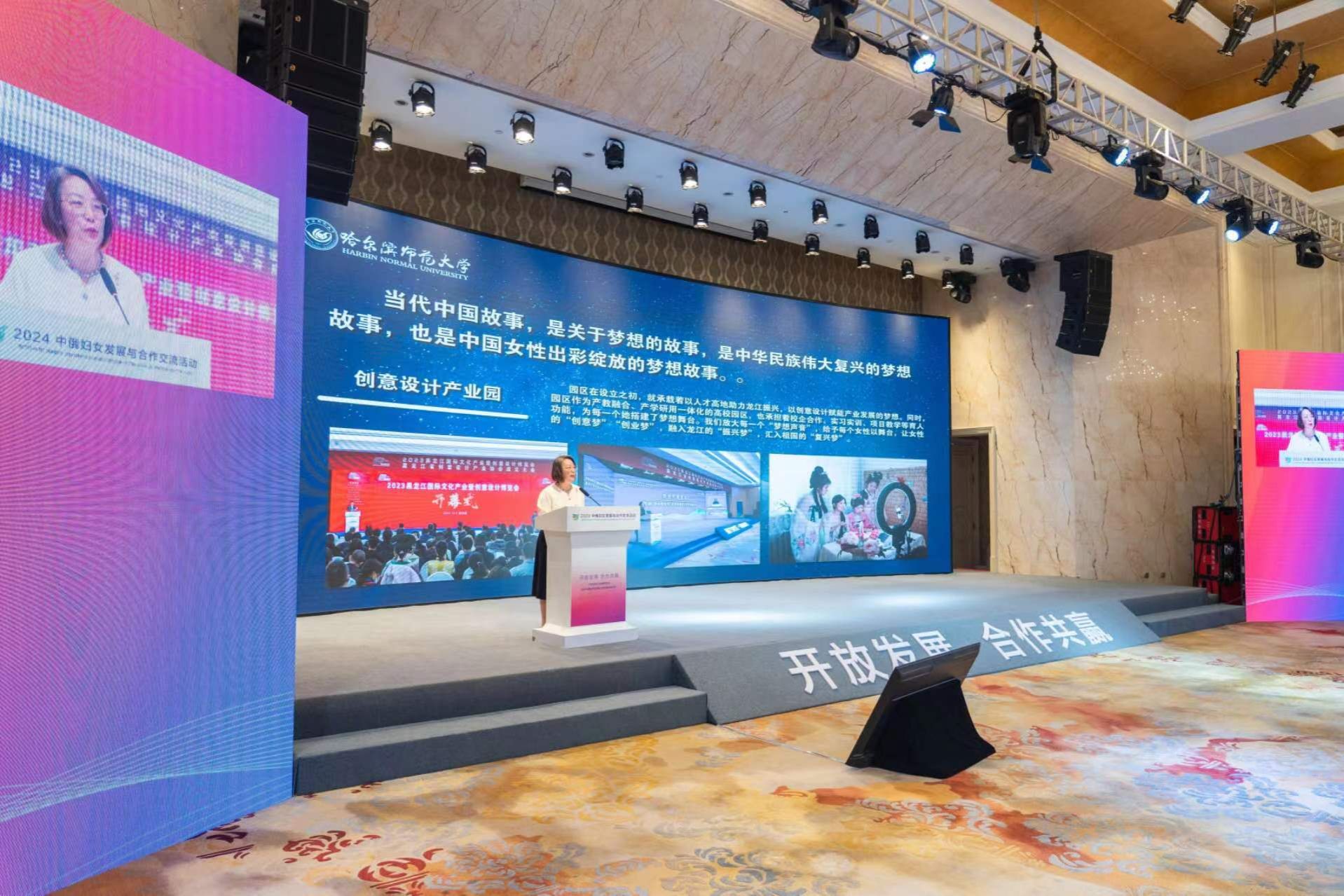 (刘国英/文)5月17日,中俄妇女发展与合作交流活动在哈尔滨太阳岛花园酒店成功举办,中俄女性社会组织代表共计100余人参加活动。该活动以“开放发展·合作共赢”为主题。俄罗斯妇女联盟主席叶卡捷琳娜·菲利普波夫娜·拉霍娃发表视频致辞,全国妇联及省、市妇联相关同志出席活动,我校党委副书记、工会主席郭砾应邀出席活动并发表演讲。