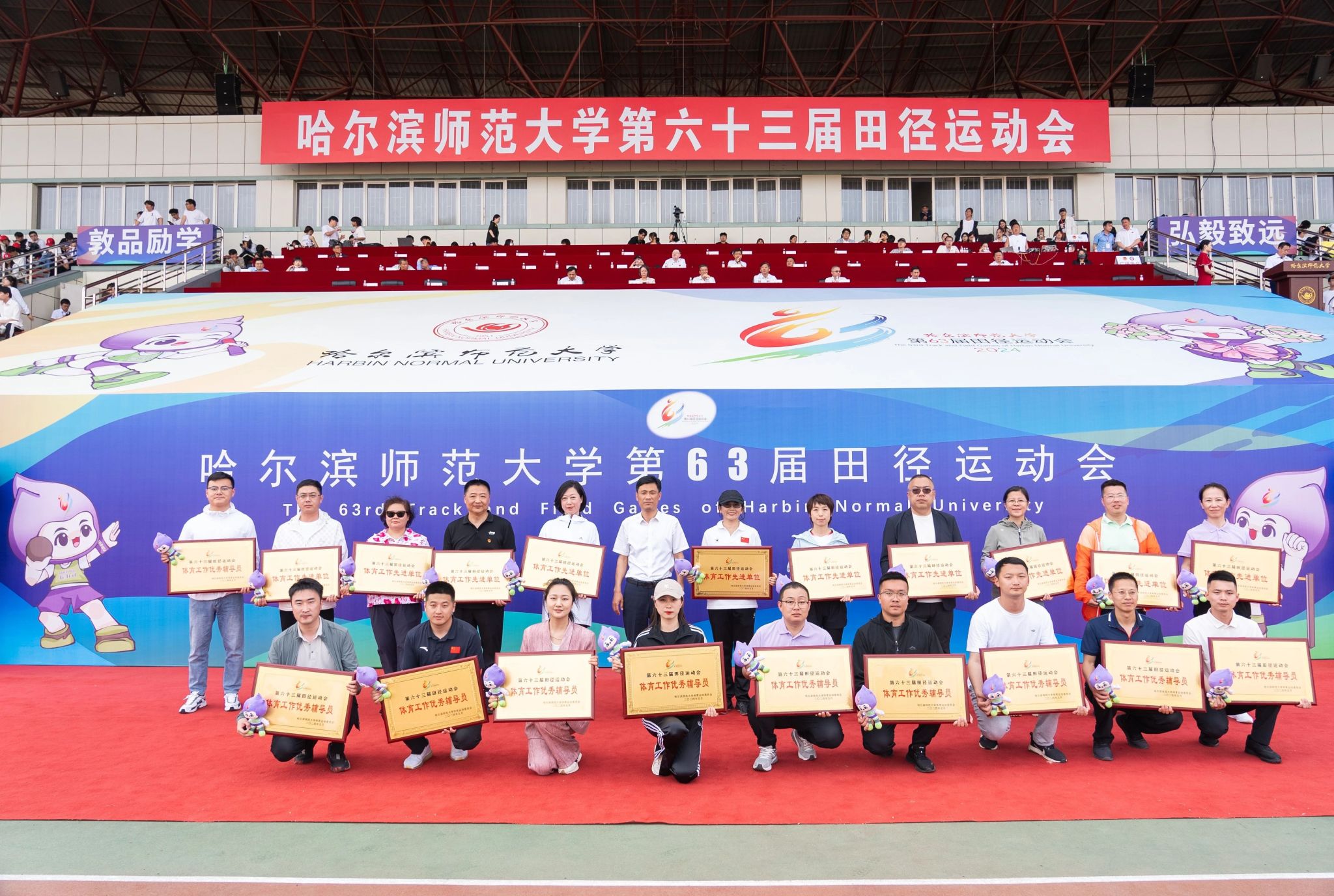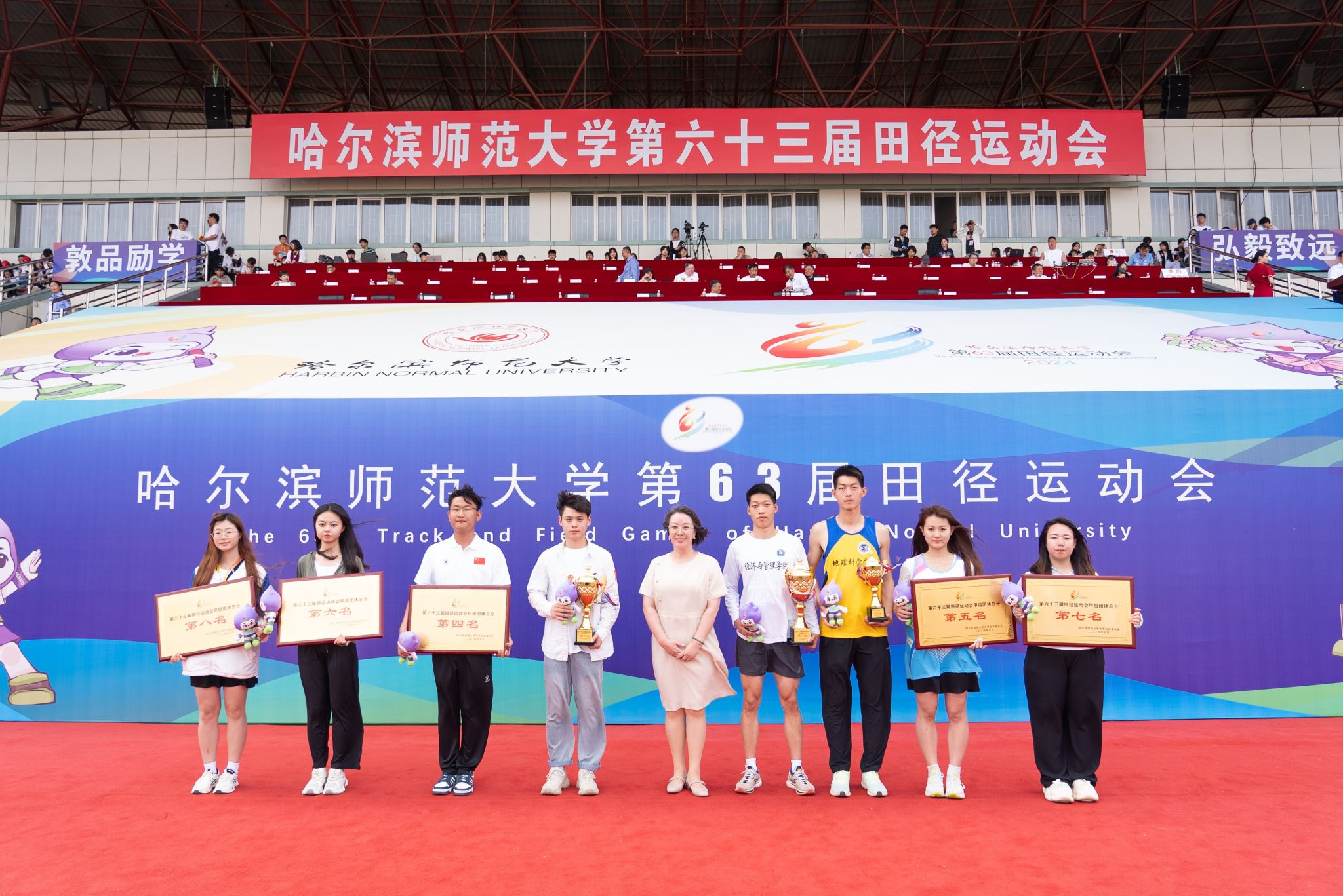 党委常委、纪委书记、省监委驻哈尔滨师范大学监察专员姜国庆为获得学生甲组女子团体总分、男子团体总分前8名的单位颁奖
