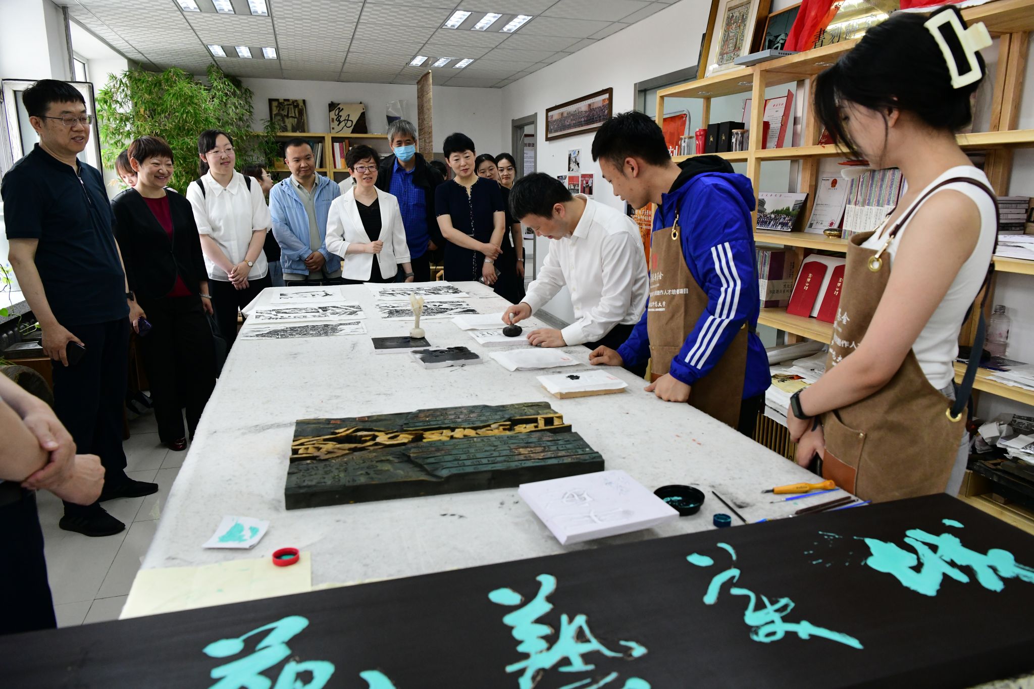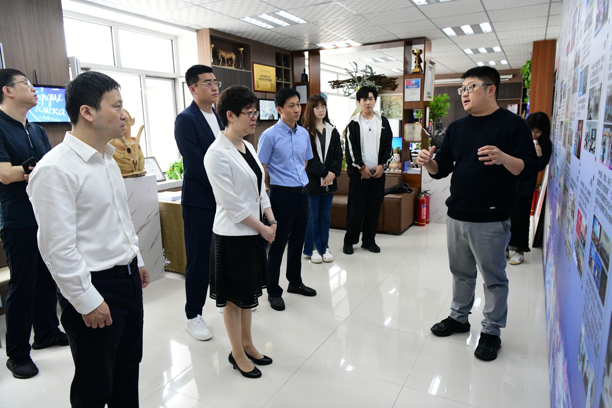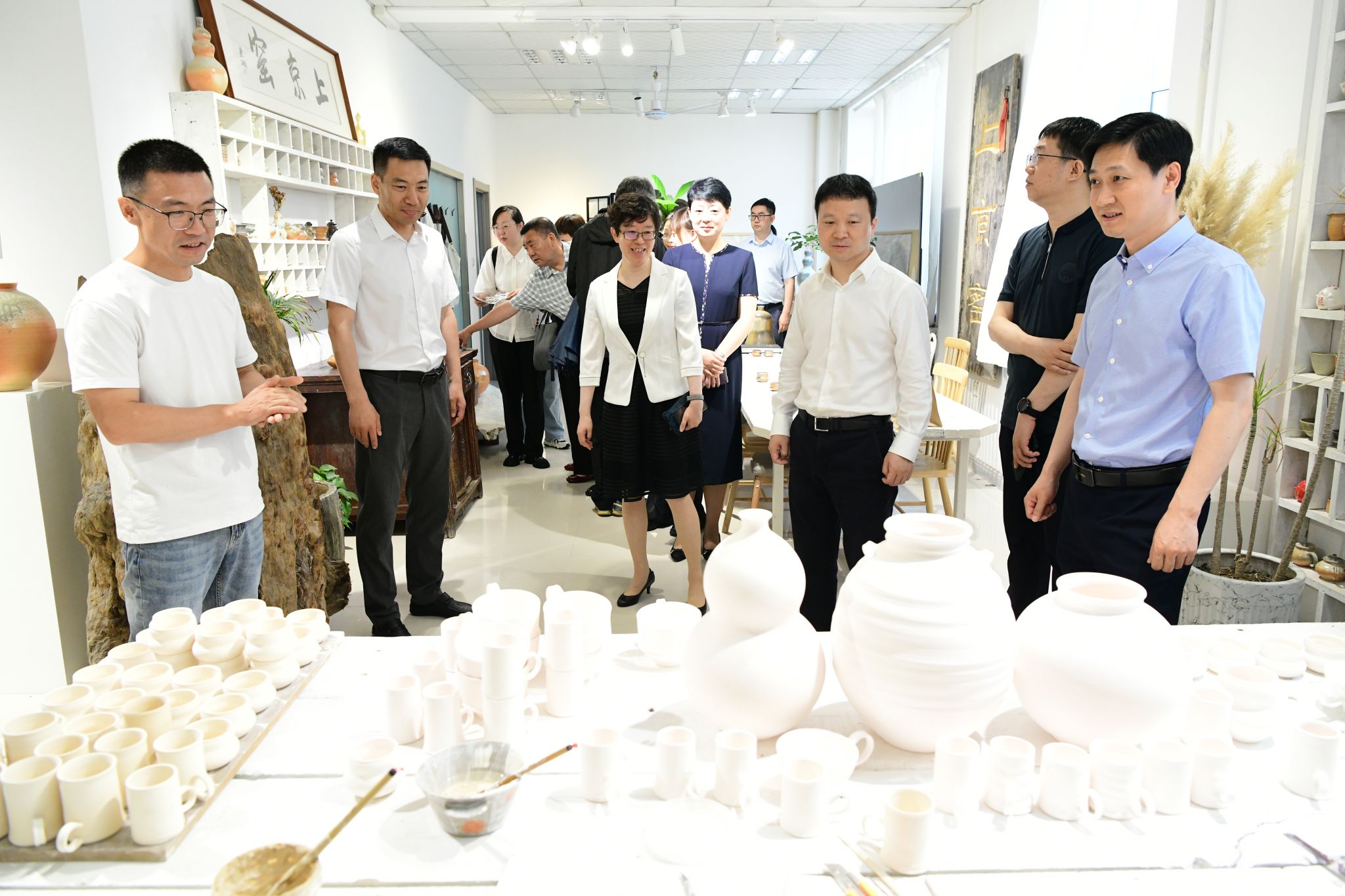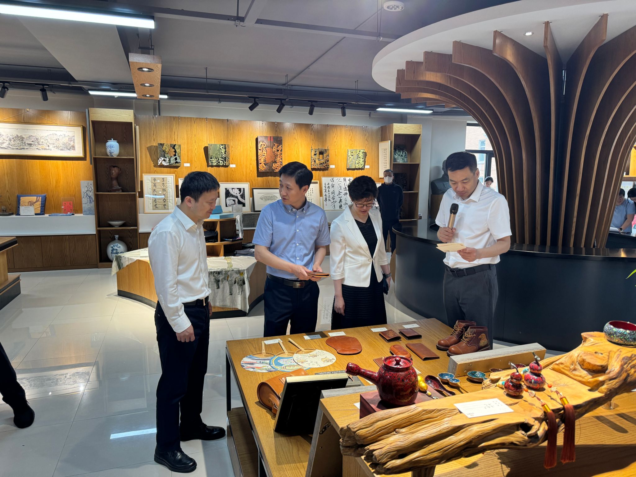 王辉对宁飞飞一行的到访表示热烈欢迎,并简要介绍了我校创意设计产业园区建设的基本情况。参访人员观看了园区宣传片,参观了创意设计产业团队设计制作的一系列创意设计成果,走访了园区各创意设计团队工作室,体验了“上京窑”黑龙江特色高温陶瓷文创产品、非物质文化黑龙江桦树皮剪纸、龙江书刻“冰雪拓”等创意设计成果,详细了解我校创意设计成果转化情况、工作室运营模式和园区版权保护情况。