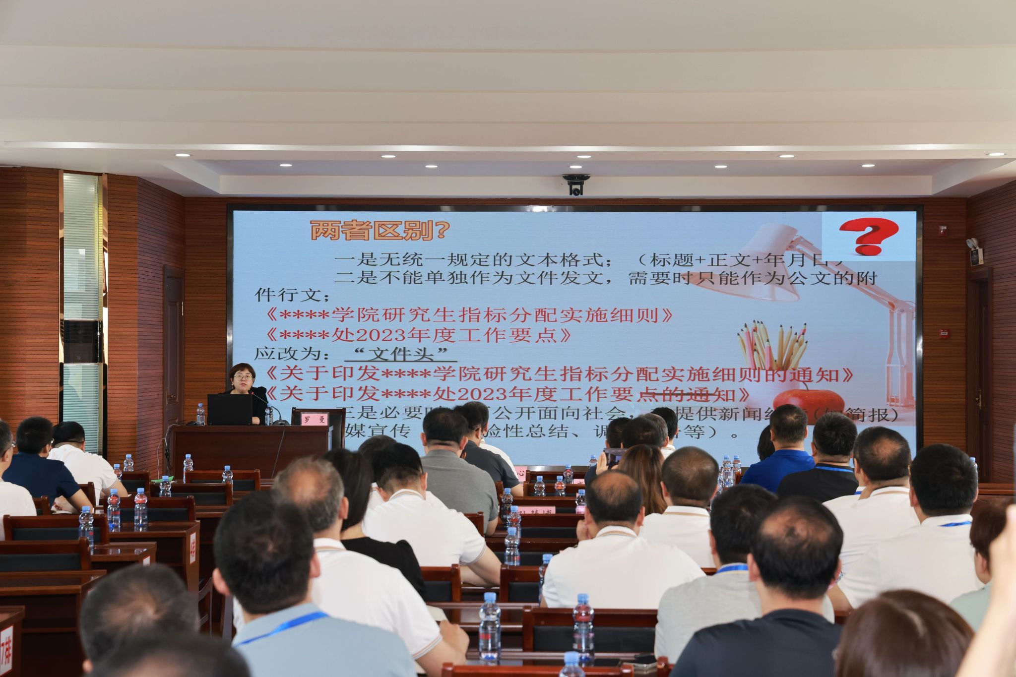 理论学习夯实基础。本着“干什么、学什么,缺什么、补什么”的原则,本次培训在课程安排上突出了理论性、实践性和互动性等特点,进一步加强了全体学员的理论基础。理论授课环节,省教育厅高等教育处处长孙世钧作了《高等学校学科专业结构优化调整的思考与对策》的专题报告;省委党校王丽作了《提高领导干部战略思维能力》的专题辅导。业务实践指导环节,学校组织了第十五、十六期业务大讲堂,党委常委、国有资产管理处处长张志宏作了《加强内控建设,全面提升学校治理能力》专题辅导;文学院副教授罗曼就《党政机关常用公文写作》作了专项指导。按照党纪学习教育工作部署和安排,学校邀请了马克思主义学院副教授金兴伟作了《以严的基调全面加强纪律建设》的专题辅导,全体学员集体观看了廉政教育警示教育片,继续推进党纪学习教育培训落实到位。
