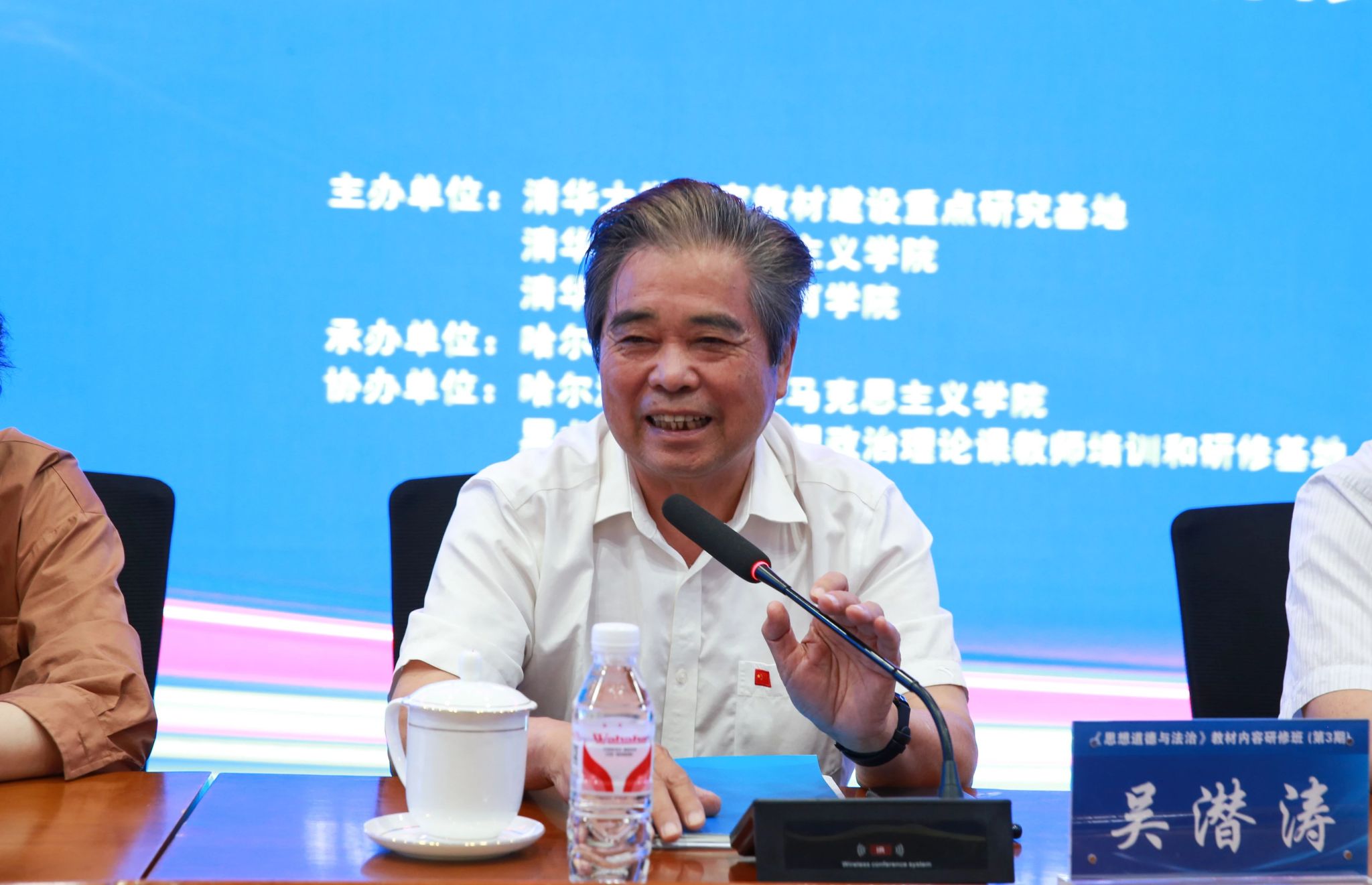 吴潜涛教授在结业式上讲话时指出,本次《思想道德与法治》教材内容研修班成功举办,得益于清华大学和哈尔滨师范大学的共同统筹策划,得益于哈尔滨师范大学的周到服务,得益于授课教师的精心指导,也得益于全体学员积极参与和认真学习。他对学员代表的发言、提交的心得和提出的建议给予高度肯定,他指出本次研修班有三方面收获:一是理论有深化。本次培训聚焦教材体系、重点难点,有助于思政课教师实现教材向教学的转化、教学向教育的转化。二是实践有探索。在培训中专家和学员共同探索教学方法,通过问题链条,破解教学难题,提升了教学针对性。三是思想有提高。学员们普遍反映本次研修班是一次知识的充电过程,在心灵上得到洗礼、思想上得到升华。他对本次研修学员提出三点希望:一是注重认真思考。他结合教材具体内容要求全体学员要把握好教材的结构逻辑、内容逻辑和表述逻辑,理解教材编写的出发点和理论维度,这是掌握教材、用好教材的前提。二是不断提高自身素养。思政课根本任务是把课讲好,就是要把教材基本问题弄通,把基本理论、基本观点进行学理化、体系化阐释,进而在课堂上把这些理论和观点传授给学生。三是要培养思政课教师的气度和风范。思政课教师要不断提升站位和视野,既要保持宏观视野,把握国家战略,同时要有为民情怀,做新时代有高尚情怀、有担当奉献精神的优秀思政课教师。