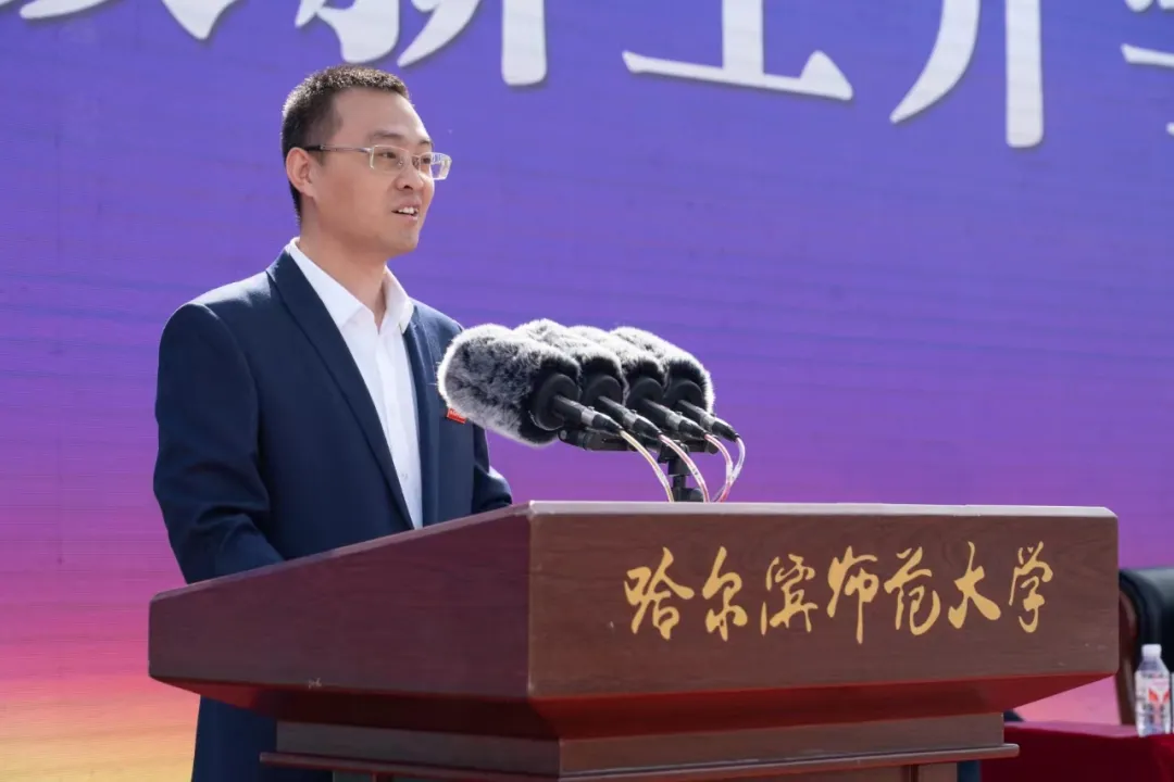 教师代表、第七届黑龙江省高校青年教师教学竞赛一等奖获得者、文学院教师徐佳超为新生送上一份心意满满的校园指南,鼓励新生去校史馆感受师大前辈们创校之初筚路蓝缕的艰苦卓绝;去图书馆增进智慧和德行,提高人生境界;去教学楼学习探索、实践创新,以学行品德照亮世道,温暖人心,成为有创造力、有进取心的哈师大人。