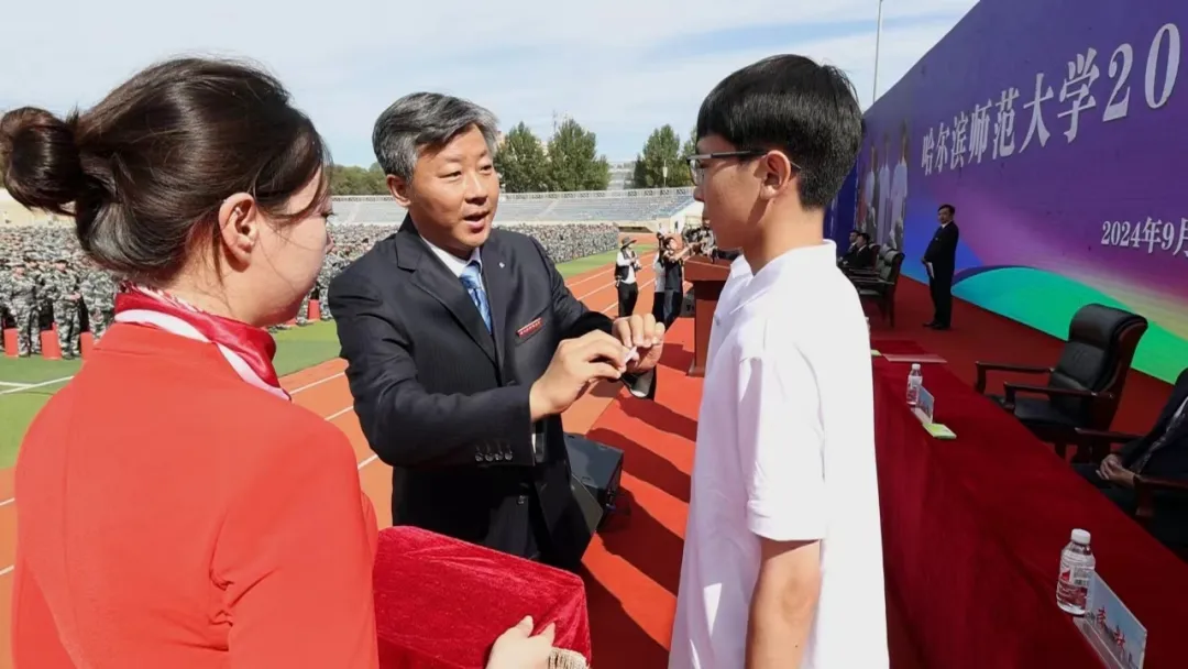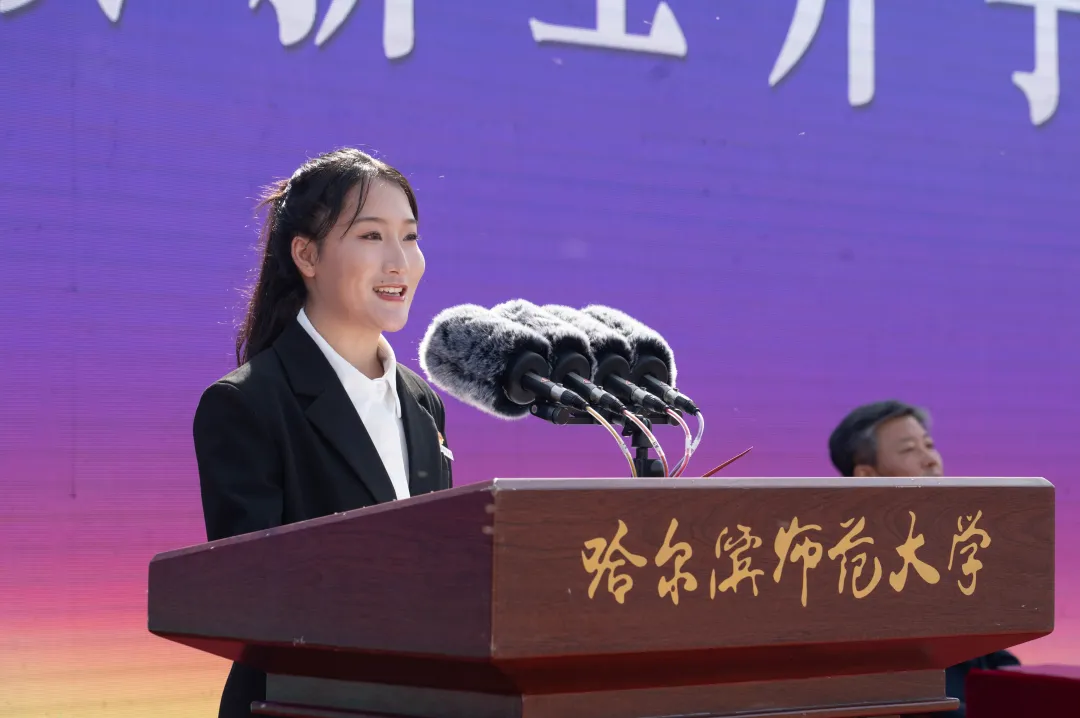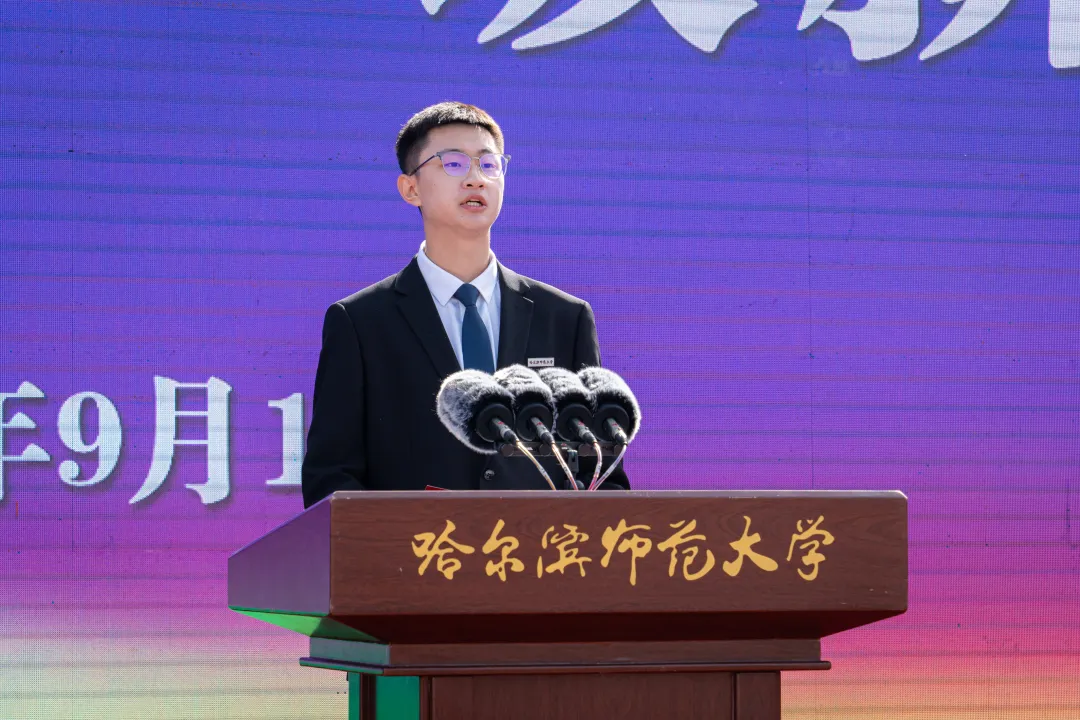 本科生新生代表、化学化工学院化学专业2024级本科生宿智豪在发言中表态,将不负韶华、不负时代、不负学校和老师们的期望与重托,继承和发扬哈师大“敦品励学,弘毅致远”的优良传统,在哈师大这片充满爱与希望的土地上书写青春华章。