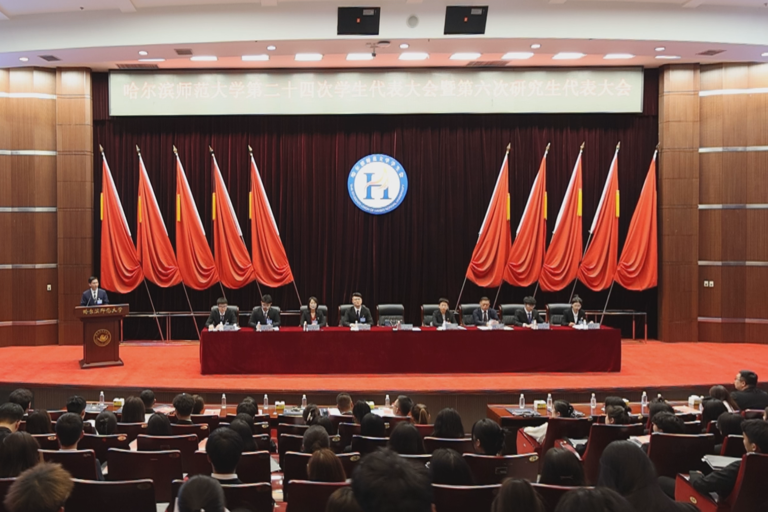 (刘强/文)9月11日下午,哈尔滨师范大学第二十四次学生代表大会暨第六次研究生代表大会在科学会堂召开。校党委副书记王辉,团省委学校部部长杨頔,黑龙江省学生联合会驻会执行主席郭旭,哈尔滨工程大学学生会主席团成员杨宇腾及学校党委学生工作部(学生处、武装部)部(处)、团委相关负责同志,各学院团委负责人、学生会秘书长、研究生会秘书长与我校476名优秀学生代表聚集一堂,共商学校学生发展大计。开幕会由校团委副书记刘强主持。
