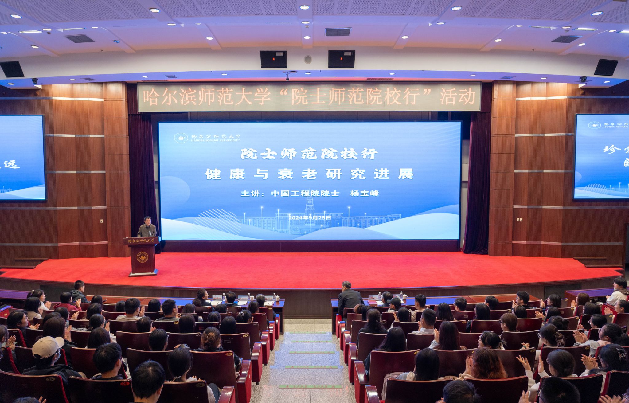(吴俊辉/文)9月25日上午,哈尔滨师范大学“院士师范院校行”活动在松北校区科学会堂举行。中国工程院院士、中国医科院学部委员、寒地心血管病全国重点实验室主任杨宝峰教授,学校党委书记孙立军,校长蒋鲲出席活动。党委常委、副校长尹剑锋,党委常委、副校长李岗,党委常委、宣传部(党委教师工作部)部长张艳君,学校相关职能部门代表,学院师生代表620余人参加活动。活动由李岗主持。
