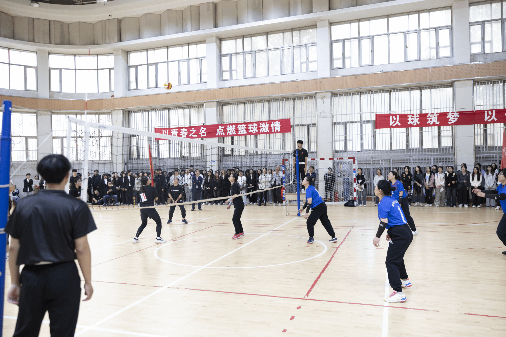 本届排球比赛分两个阶段进行。第一阶段小组赛采取分组循环赛制,第二阶段淘汰赛采取交叉淘汰赛制,大大提高了比赛的竞技性。比赛现场气氛热烈,精彩纷呈,充分展现了我校教职工积极向上、顽强拼搏、奋勇争先的良好精神风貌。赛场上,运动员们尽情挥洒汗水,尽享运动带来的健康和快乐;他们精神饱满,斗志昂扬,每一次坚定不移的示意和传球,每一次毫无保留的跃起和扣杀,每一次无所畏惧的拦网和救球,每一次精彩配合和得分都赢得了场外观众的热烈欢呼。赛场之外,前来观赛的师生组成了啦啦队,为场上的运动员鼓舞士气,加油助威,比赛现场激情澎湃,活力四射。