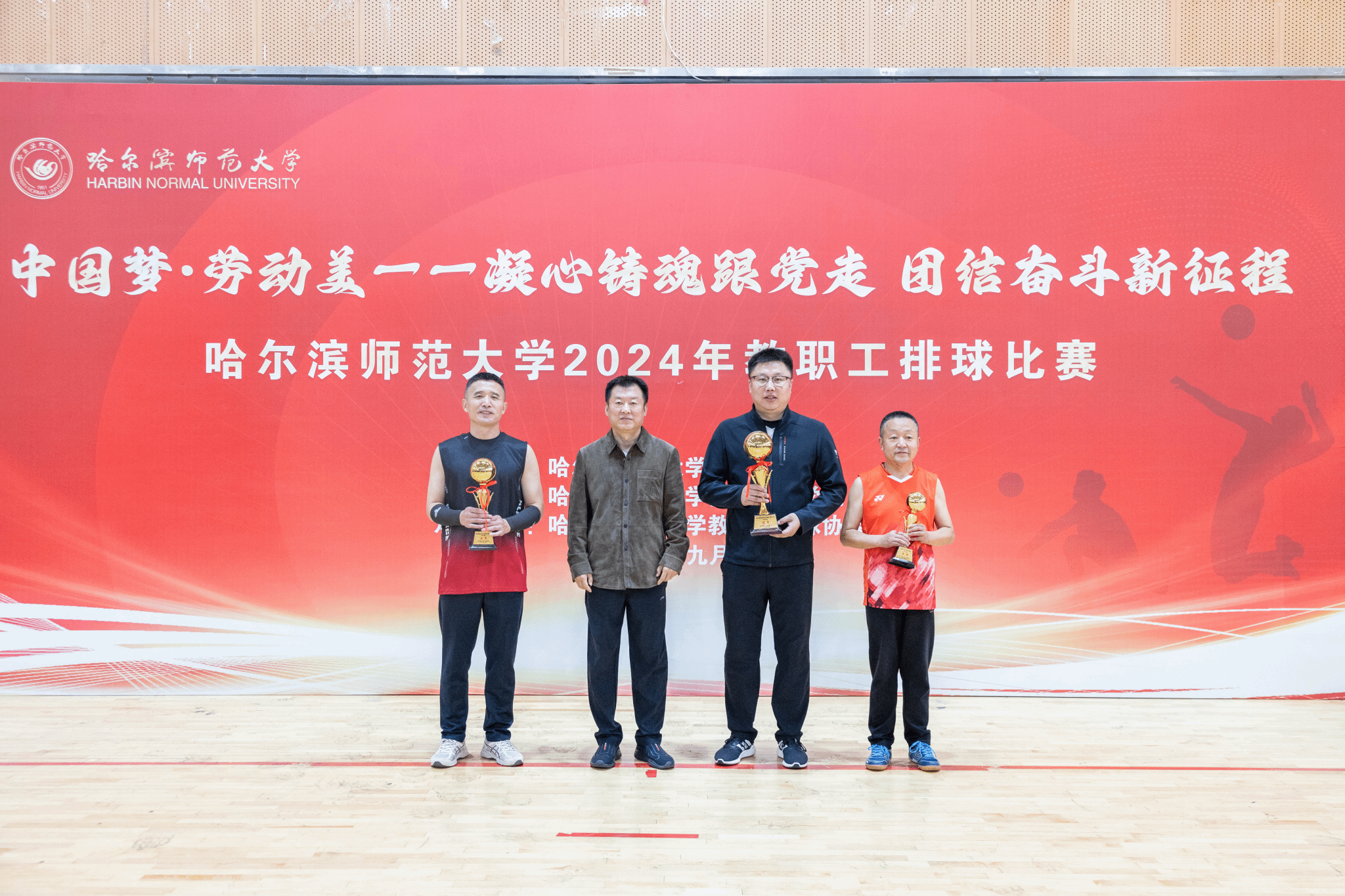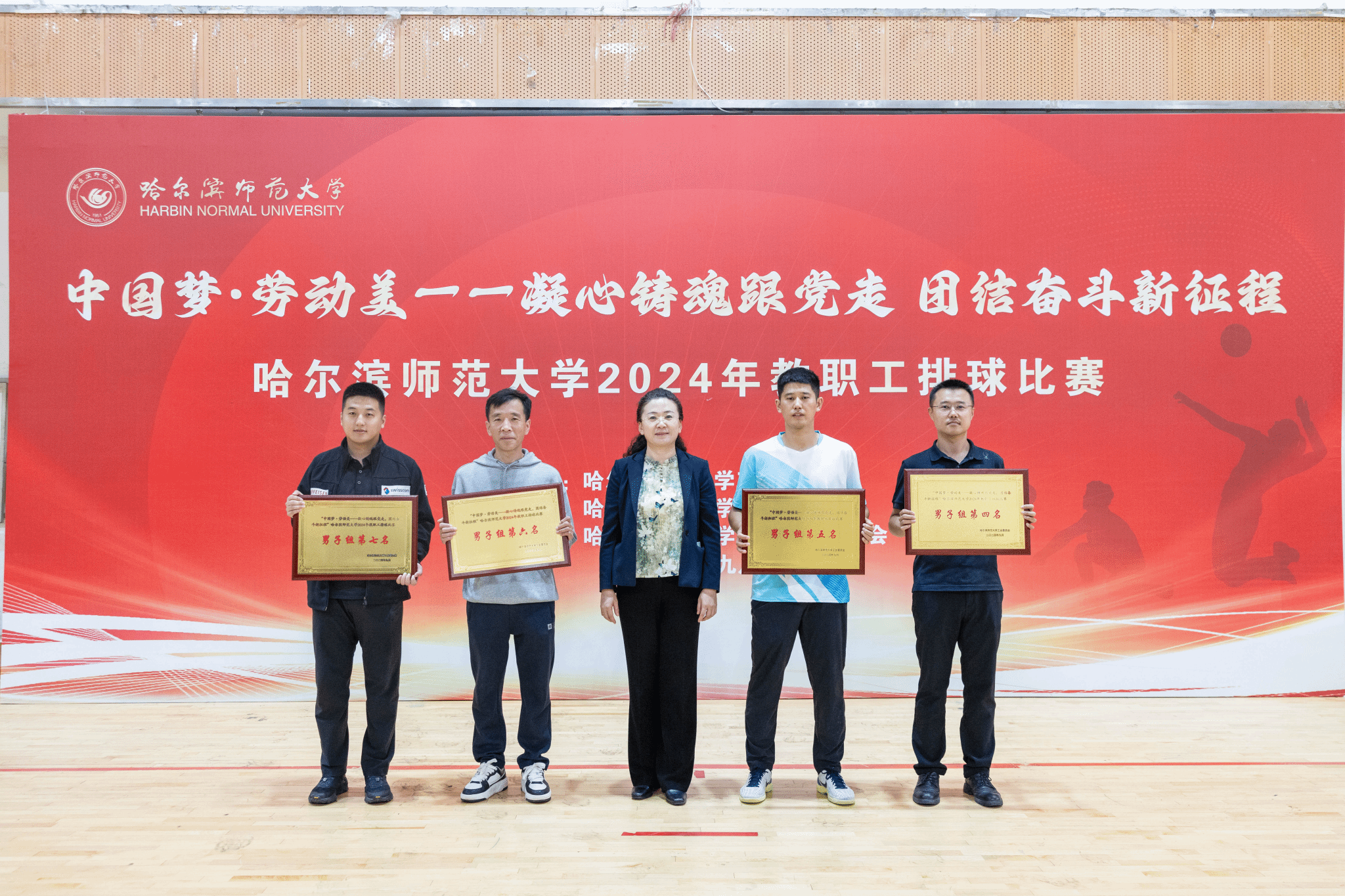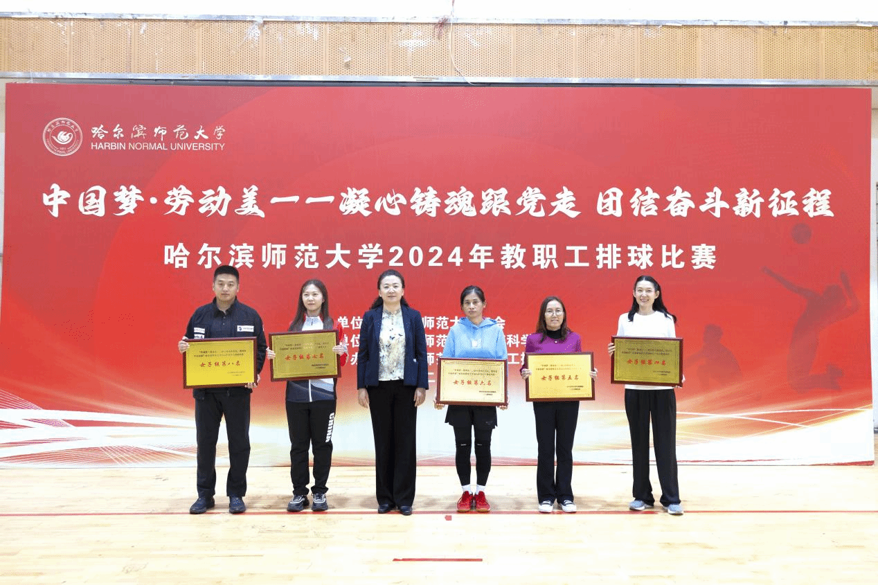 (万浩然/文)9月25日,“中国梦·劳动美——凝心铸魂跟党走 团结奋斗新征程”哈尔滨师范大学2024年教职工排球比赛在我校松北校区排球馆圆满落下帷幕。比赛历时6天80余场次,共有来自全校19个基层工会36支代表队、300余名教职工参加比赛。决赛之后举行了颁奖仪式,校长蒋鲲,党委常委、副校长尹剑锋,党委常委、副校长李岗,党委常委、宣传部(党委教师工作部)部长张艳君分别为获得男子组、女子组前八名,最佳球队奖、优秀组织奖、优秀裁判员颁奖。工会常务副主席杨世君主持颁奖仪式。
