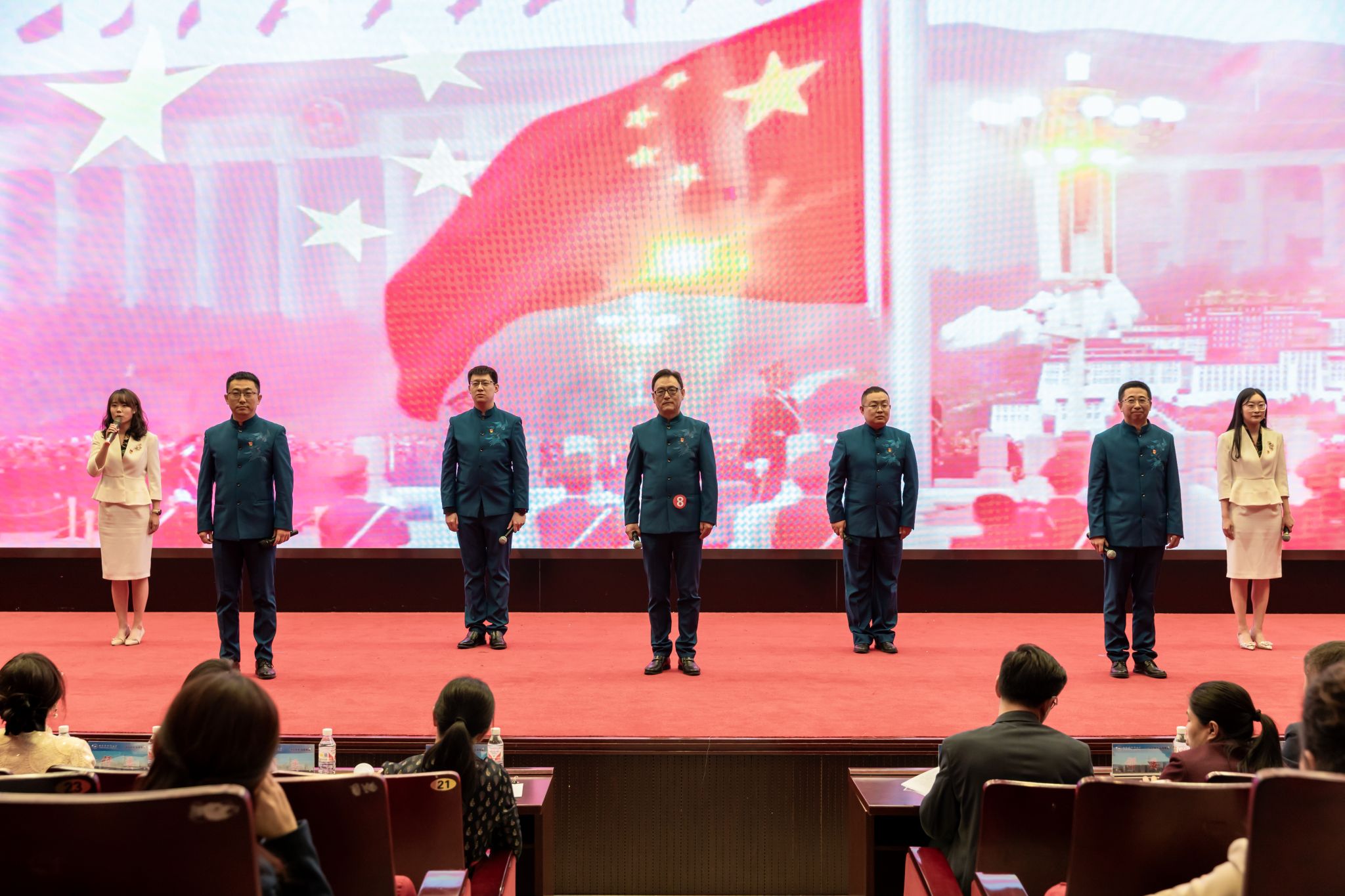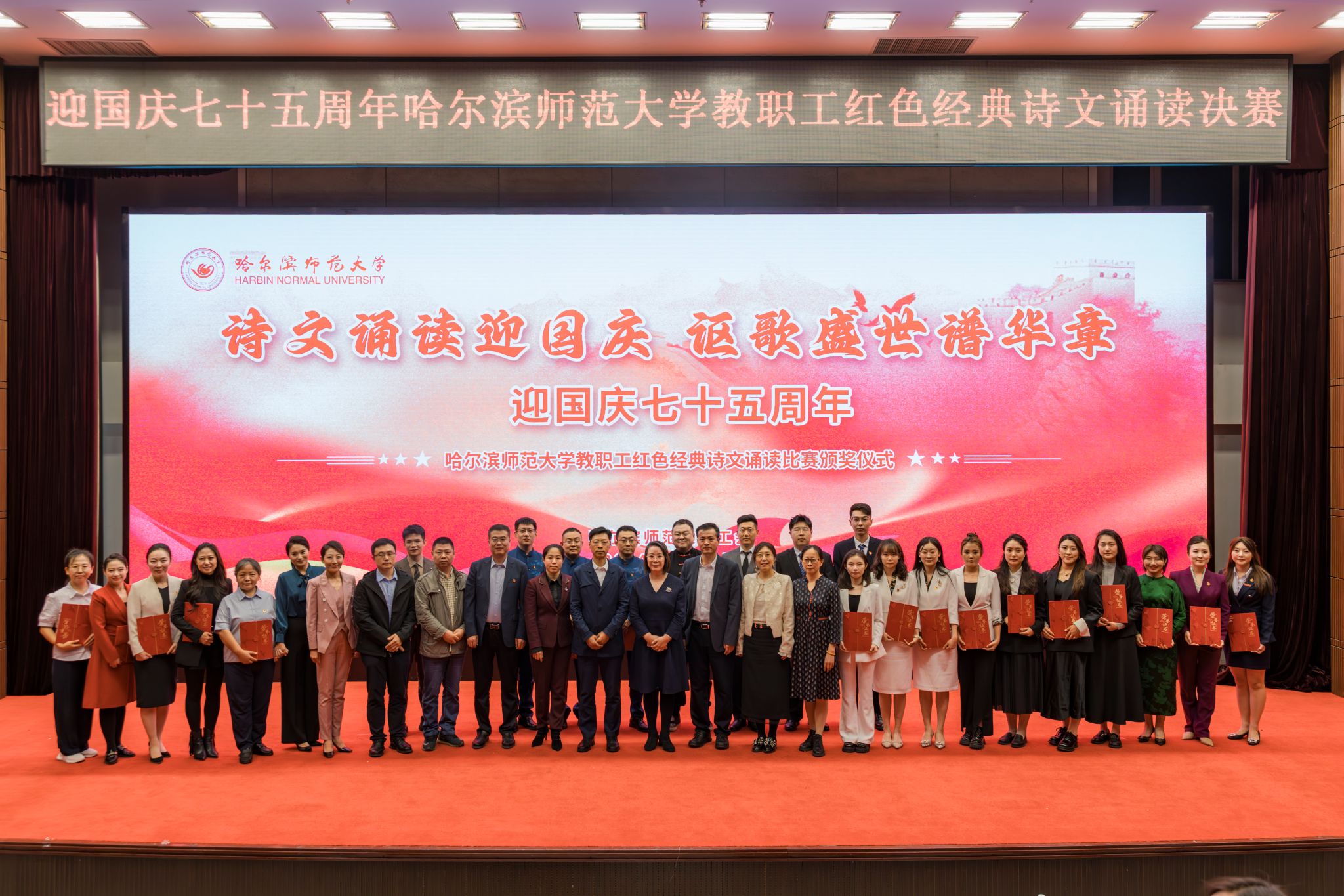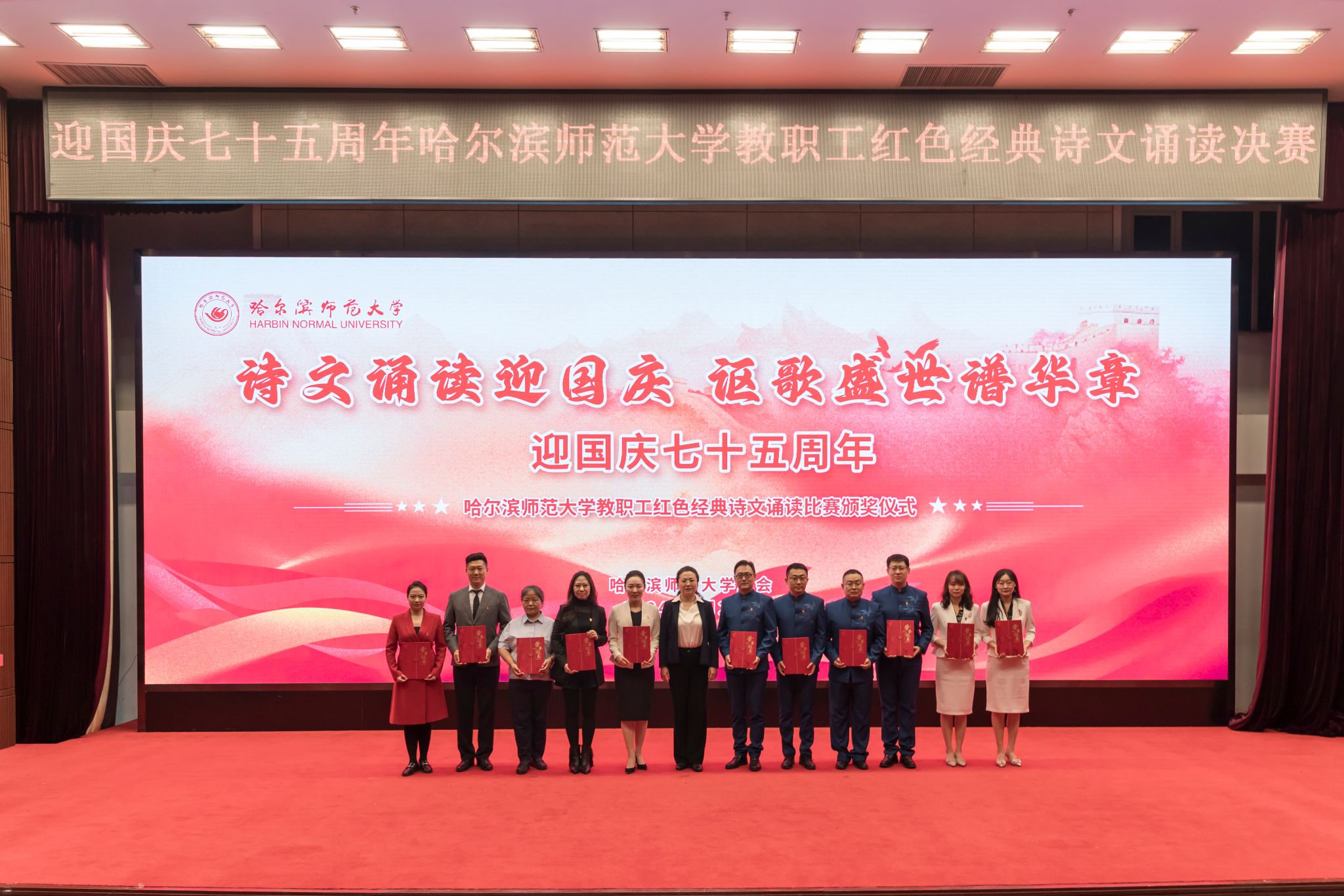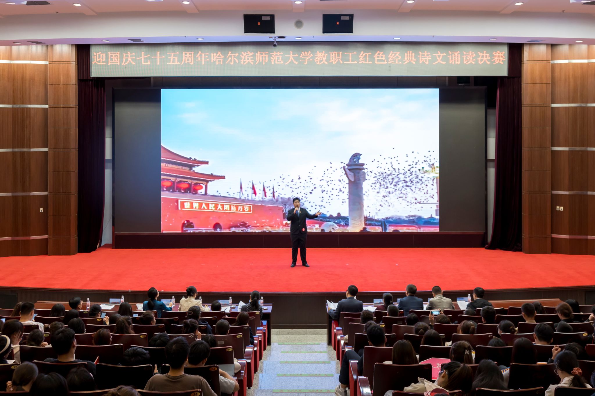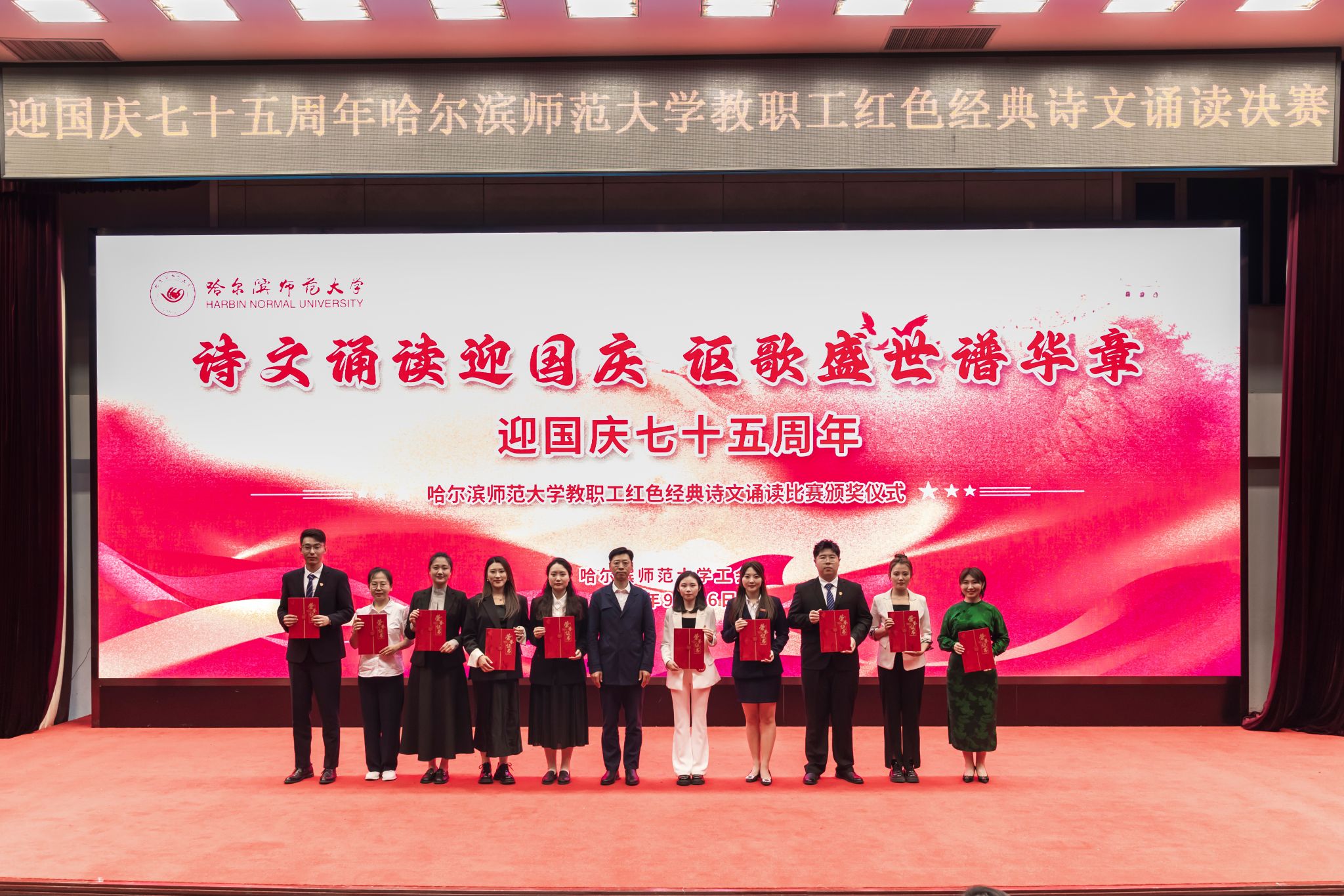 (赵慧宁/文)七十五载栉风沐雨,七十五载春华秋实。在全国上下喜迎新中国成立75周年之际,9月26日,由校工会与传媒学院携手举办的以“诗文诵读迎国庆,讴歌盛世谱华章”为主题的迎国庆七十五周年哈师大教职工红色经典诗文诵读比赛在我校松北校区科学会堂圆满落下帷幕。校党委副书记、工会主席郭砾,党委常委、宣传部(党委教师工作部)部长张艳君,600余名师生代表现场观看诗文诵读决赛并参加颁奖仪式。决赛由传媒学院教师尹航主持。