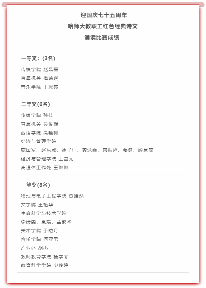 此次诗文诵读活动的成功举办,将红色经典、爱国情怀与诗歌韵味融为一体,不仅是对经典诗文的一次深情致敬,更是对家国情怀的深刻诠释,进一步推动了广大教职工对中华优秀传统文化的热爱与传承,激发了我校广大教职工强烈的责任感与使命感,用实际行动向中华人民共和国成立75周年献礼。