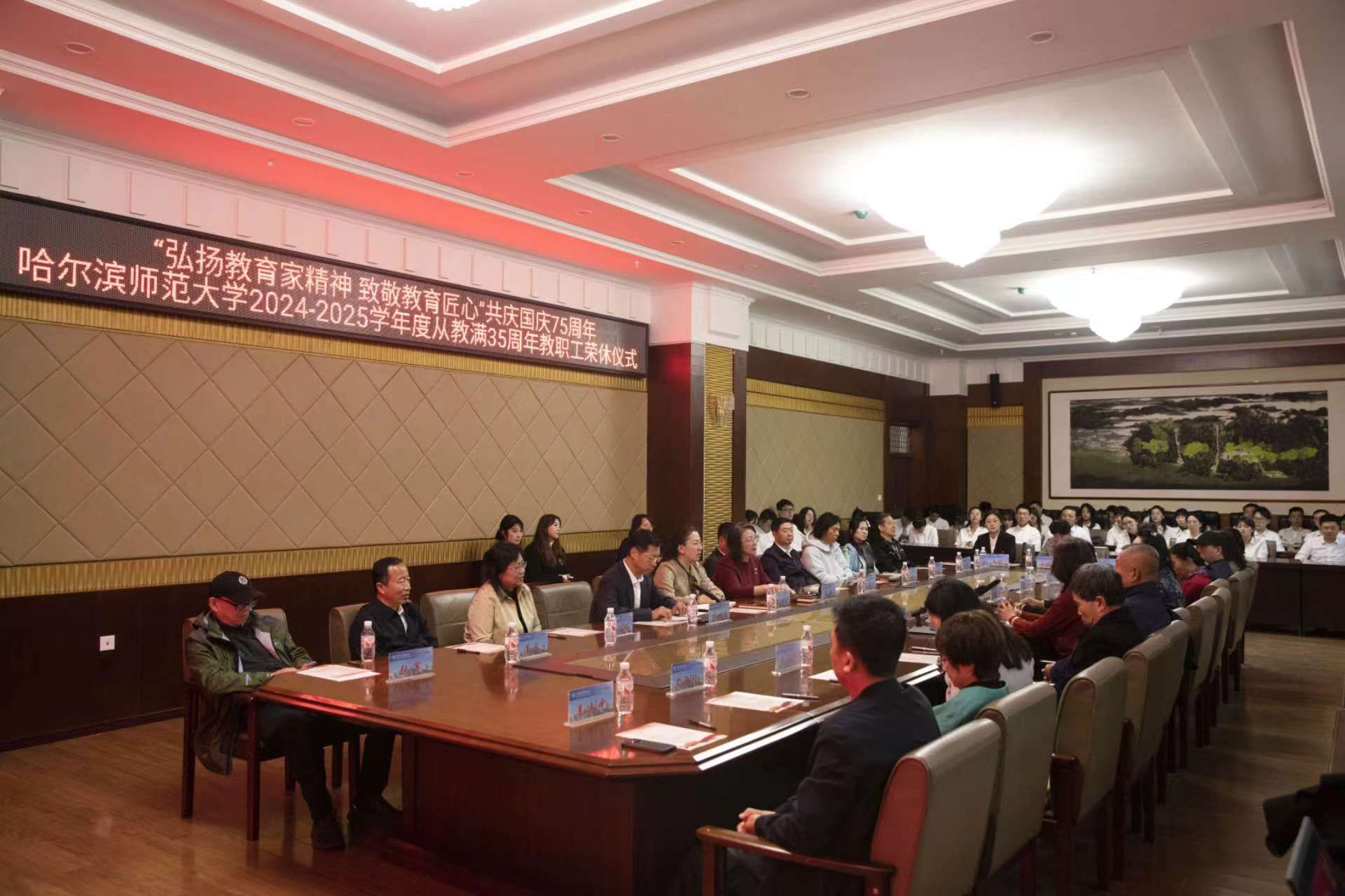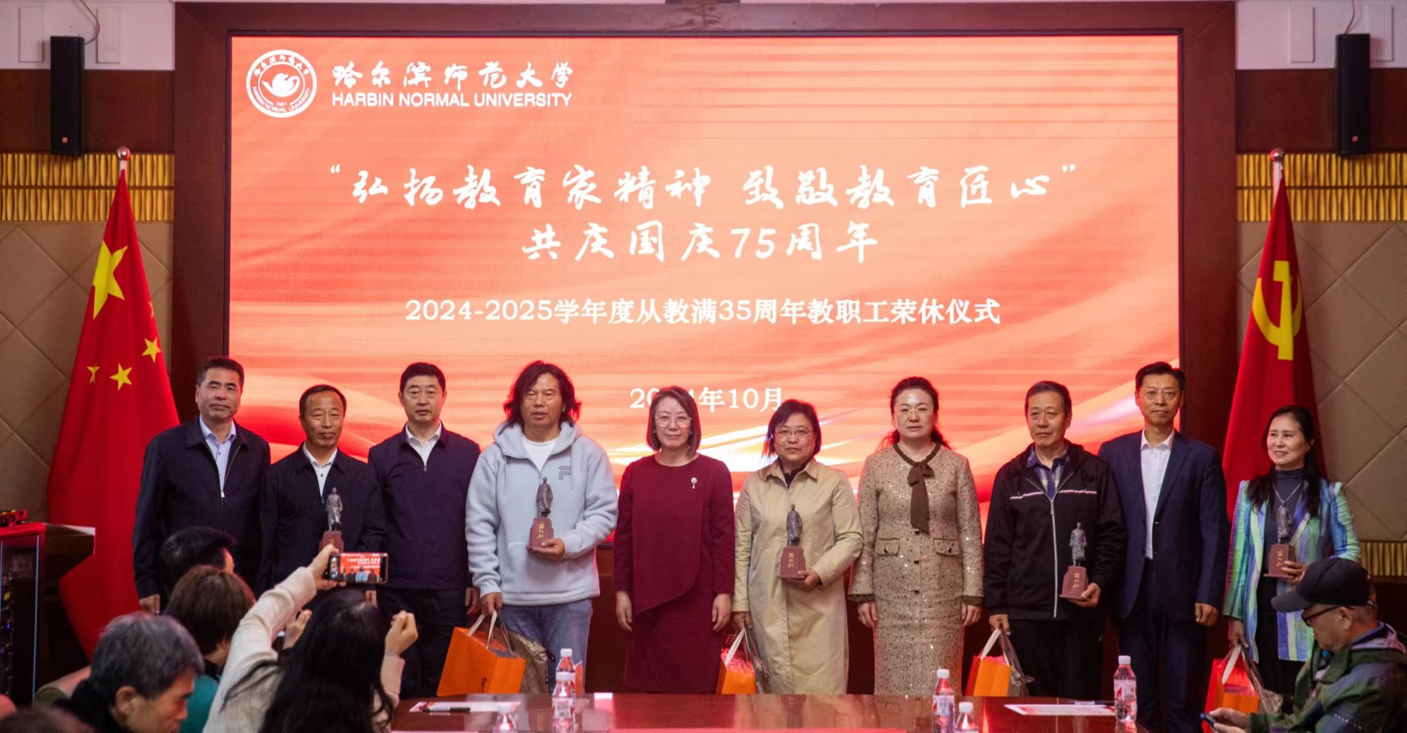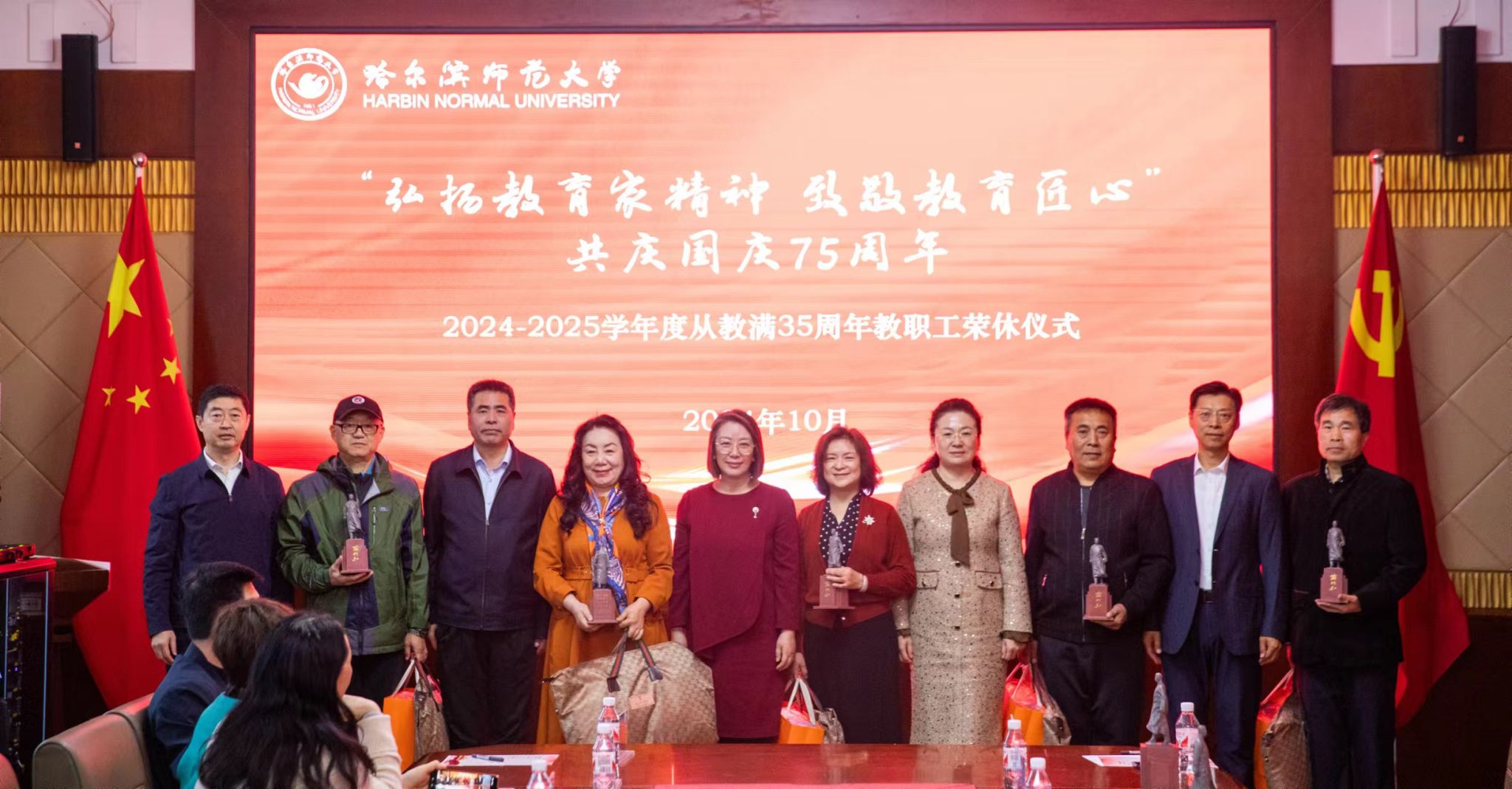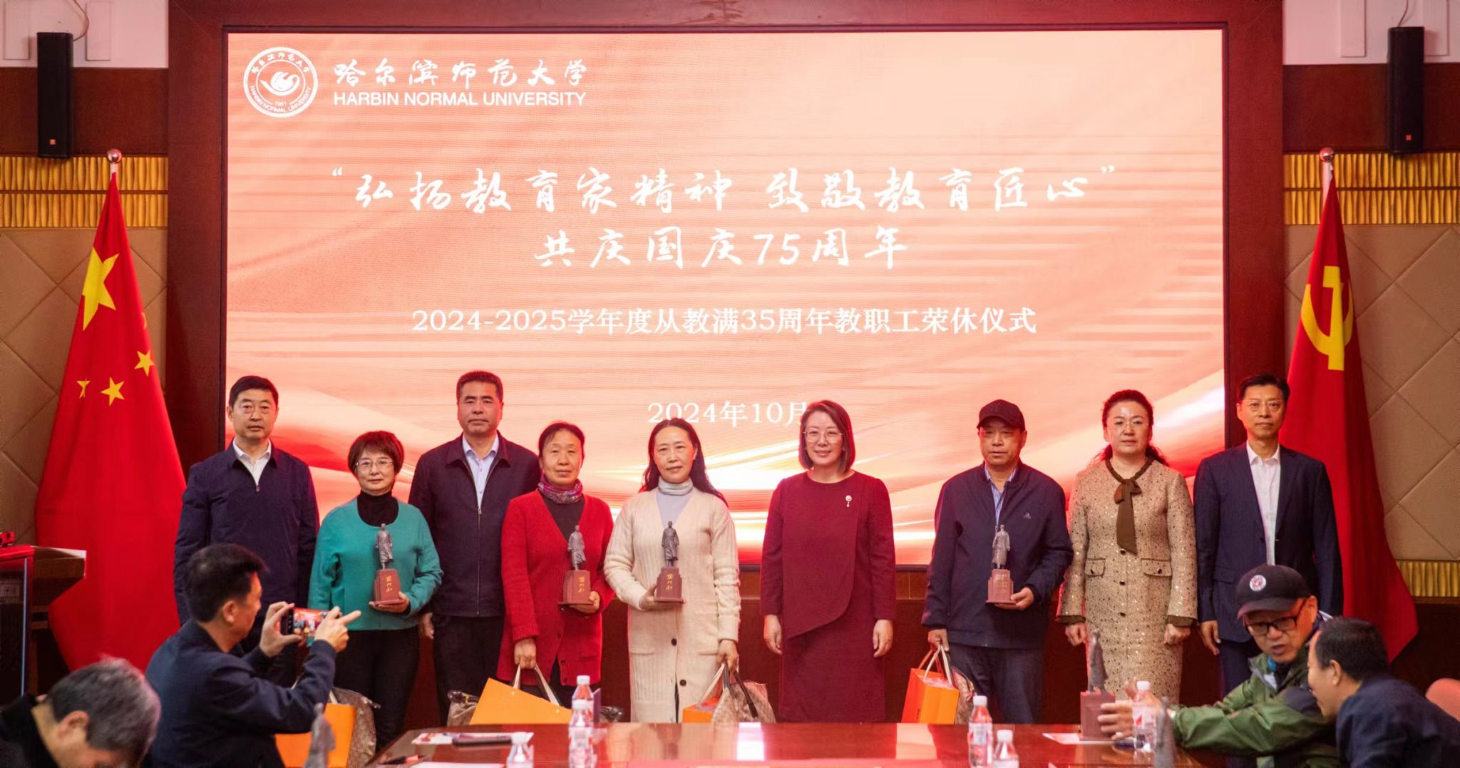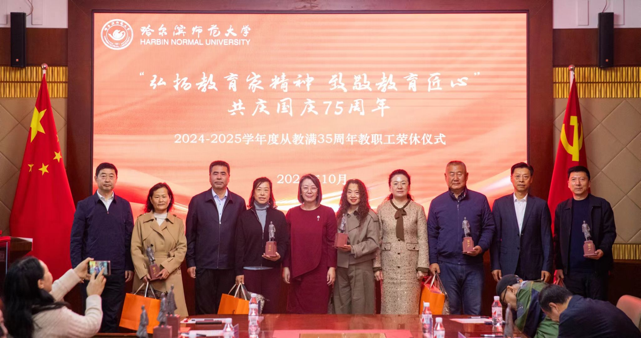 (崇明宇/文)10月10日上午,“弘扬教育家精神 致敬教育匠心”共庆国庆75周年哈尔滨师范大学2024-2025学年度从教满35周年教职工荣休仪式在我校松北校区举行。党委书记孙立军、校长蒋鲲专程看望、慰问老教师并合影留念。党委副书记、工会主席郭砾,党委常委、组织部部长刘可心,党委常委、宣传部(党委教师工作部)部长张艳君,19名退休老教师代表,相关单位负责人、基层工会主席,校工会全体干部及40余名新入职教师代表参加荣休仪式。仪式由校工会常务副主席杨世君主持。