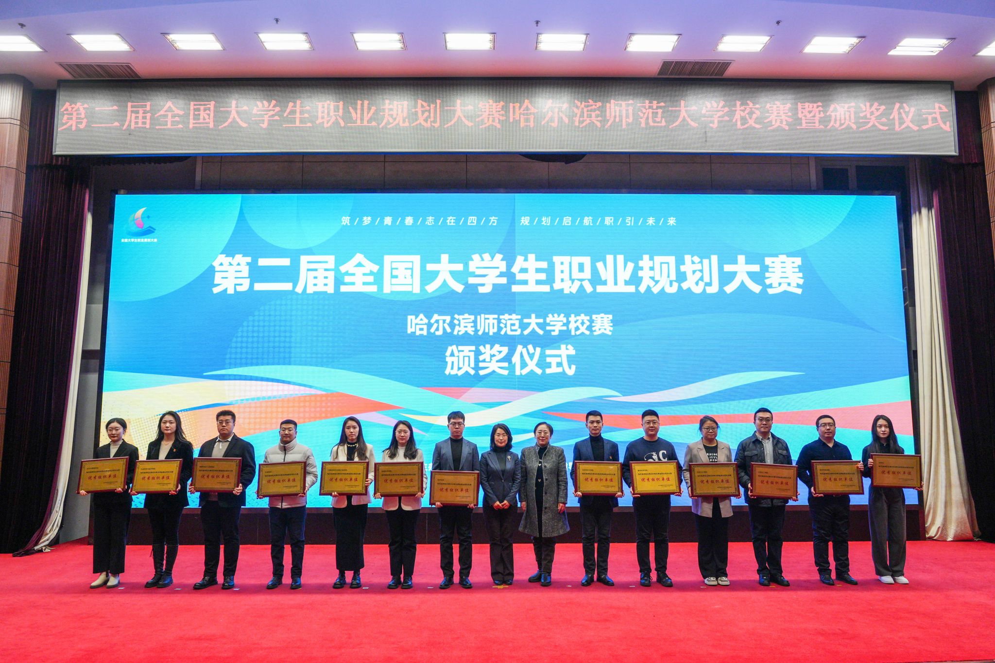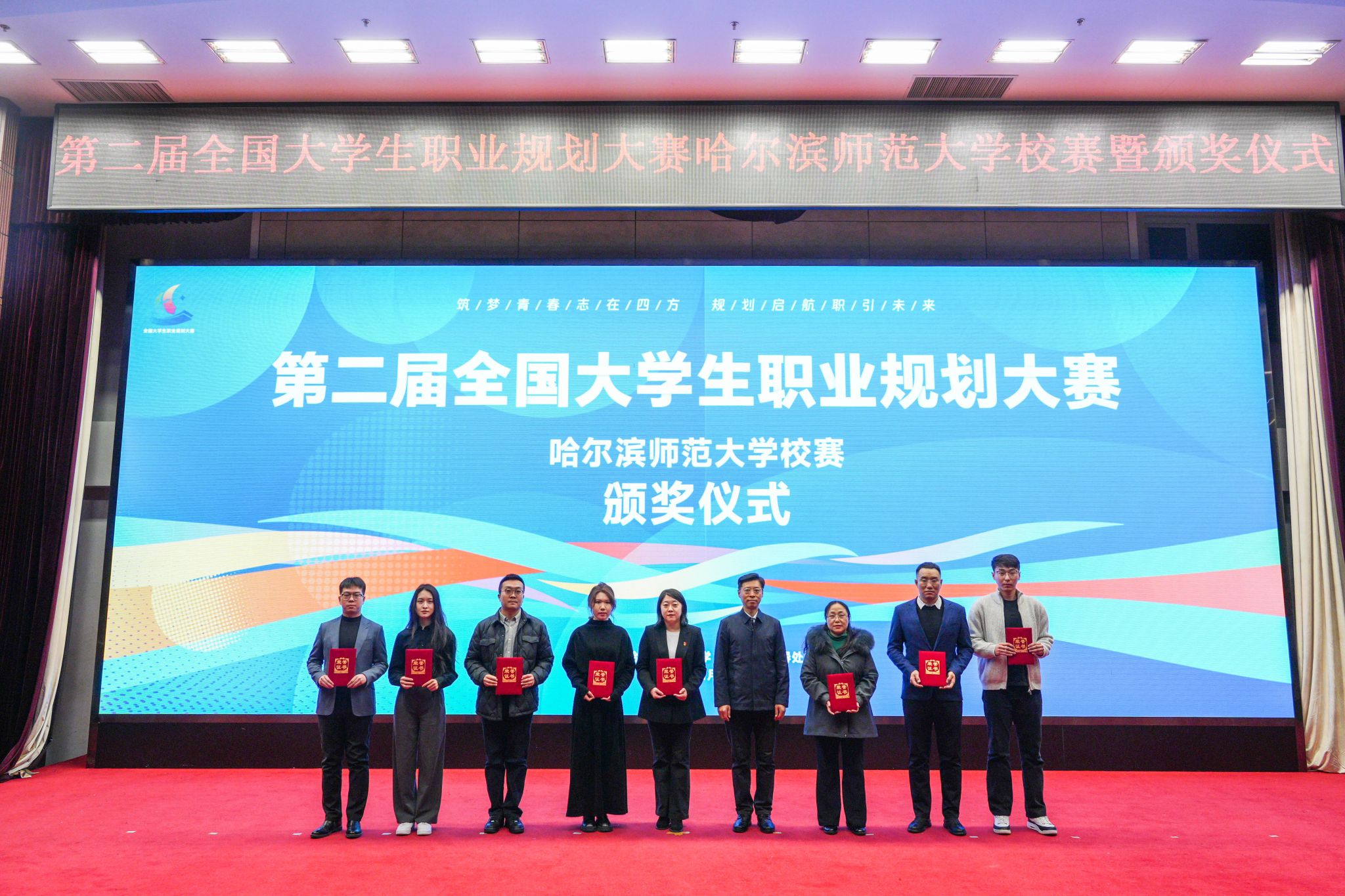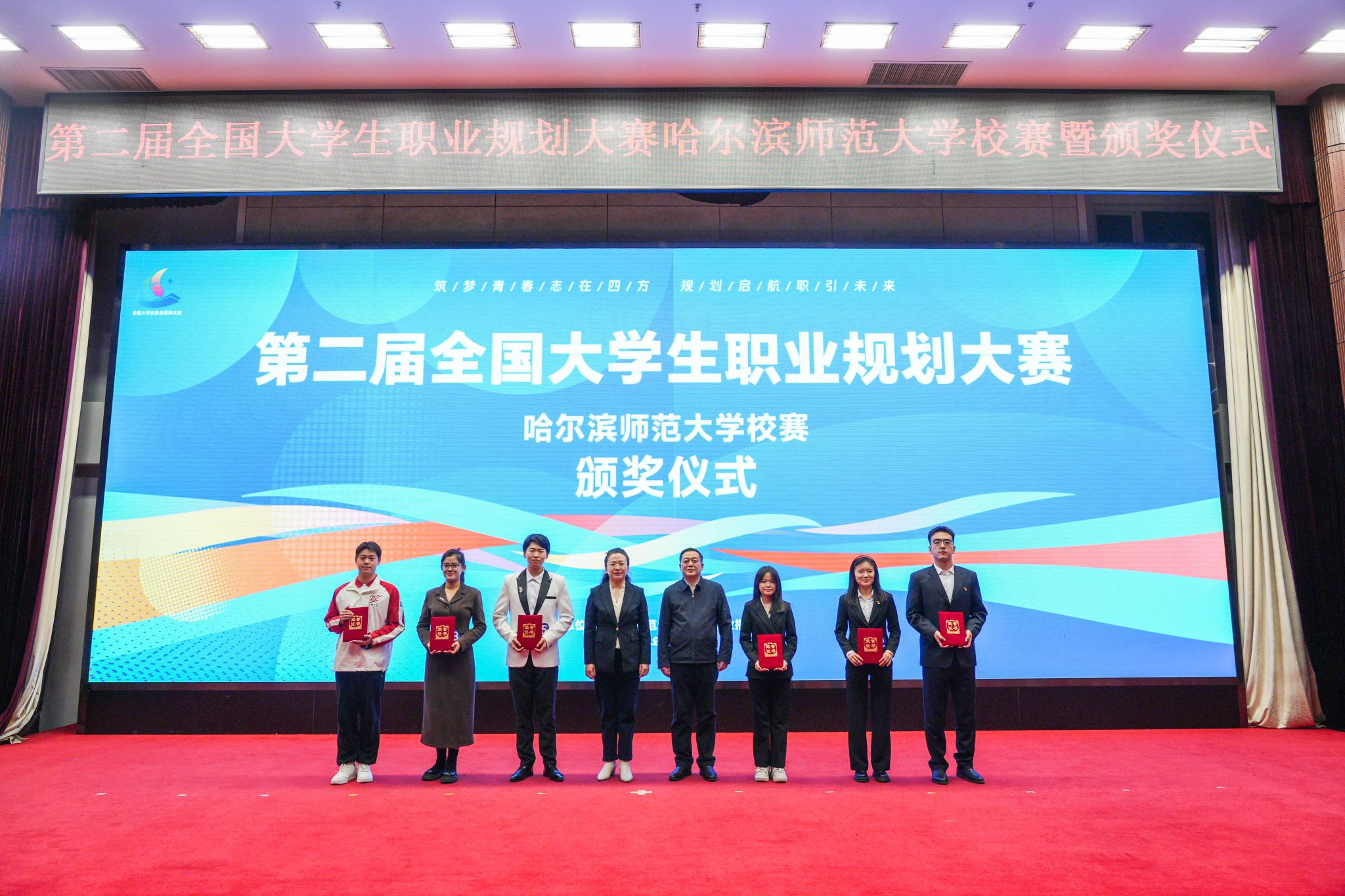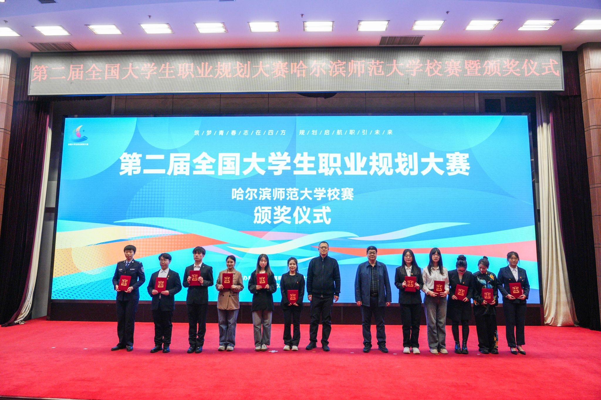 为贯彻落实党中央、国务院关于高校毕业生就业工作决策部署,增强大学生职业规划意识与能力,引导学生树立正确择业就业观,我校于11月27日在科学会堂举办以“筑梦青春志在四方 规划启航职引未来”为主题的第二届全国大学生职业规划大赛哈尔滨师范大学校内选拔赛暨颁奖仪式。校党委副书记、工会主席郭砾,党委常委、宣传部(党委教师工作部)部长张艳君,学校相关部处负责人及各学院党委副书记、辅导员及学生代表600余人现场观赛。省大学生就业创业指导中心派观察员观摩比赛。比赛邀请教育、企业、人力资源管理学科领域专家担任评委。