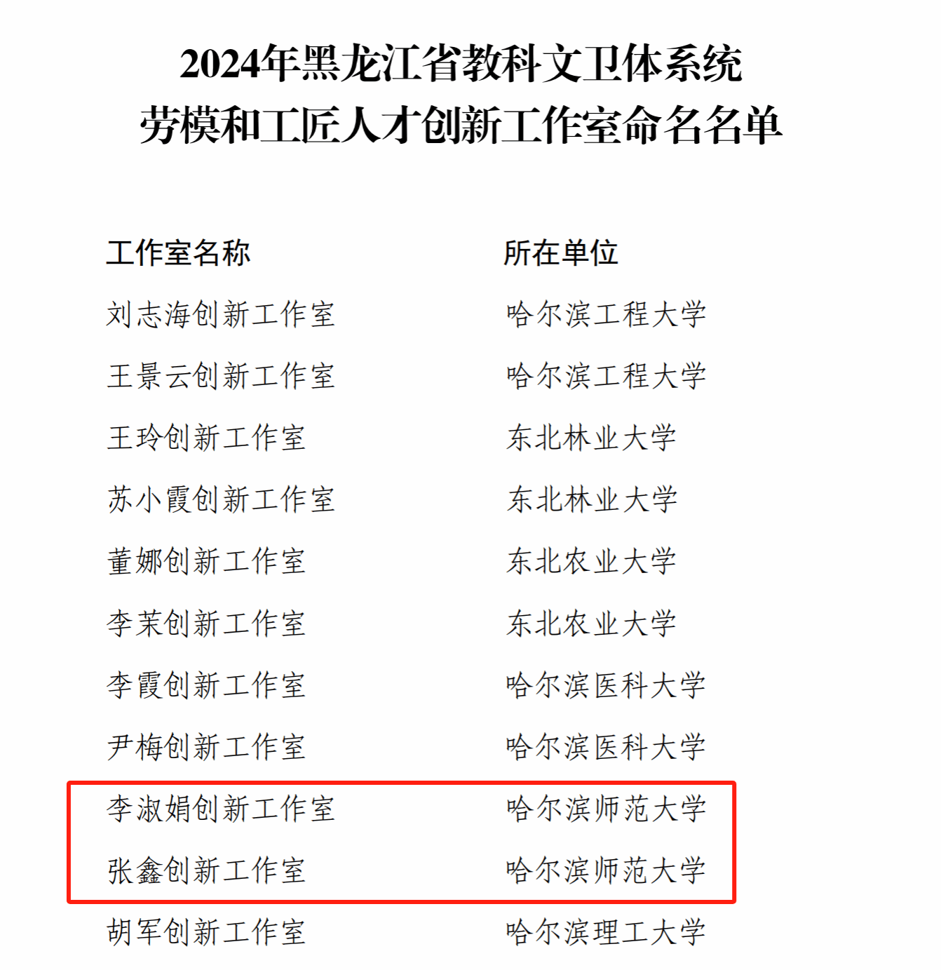 日前,2024年黑龙江省教科文卫体系统“劳模和工匠人才创新工作室”评选结果揭晓。我校推荐的以领衔人命名的历史文化学院院长、省劳模李淑娟创新工作室,美术学院雕塑系教师张鑫创新工作室被黑龙江省教科文卫体工会命名为黑龙江省教科文卫体系统“劳模和工匠人才创新工作室”。