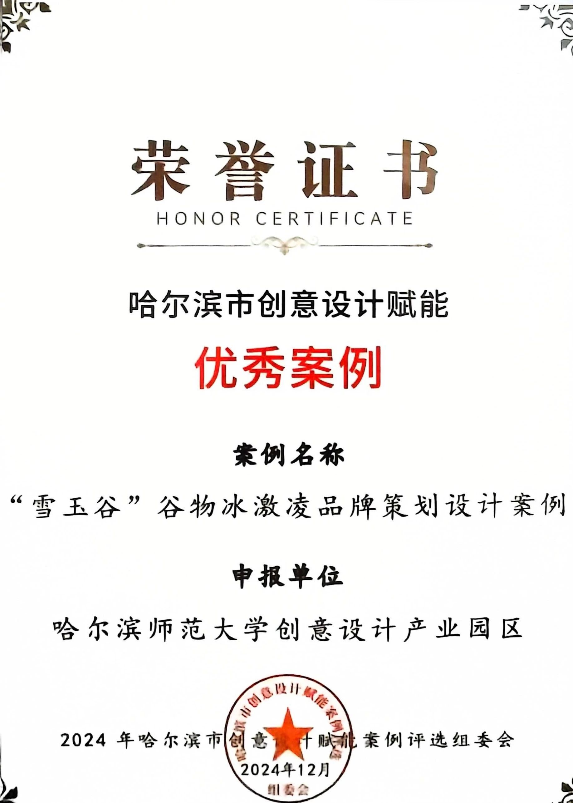 “‘雪玉谷’谷物冰淇淋品牌策划案例”由我校创意设计产业园入驻团队教师裴佳兴主持,项目服务省农投集团金谷大厦以“五常大米”“鲜食玉米”为原料的谷物冰淇淋创新型产品开发,完成了品牌命名、品牌定位、品牌战略、产品线规划、品牌愿景、品牌价值体系、品牌营销计划、品牌超级广告语等全案策划,“长出来的清甜、种出来的雪糕”“每一根雪糕、生产周期都超过200天”等产品标识深入人心,助推金谷大厦将谷物冰淇淋作为向年轻消费者推介龙江优质农产品的时尚载体,形成高频消费、年轻属性、跨界融合的酒店新零售产品,得到省市领导的高度评价。