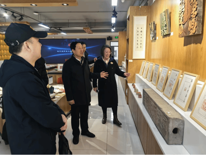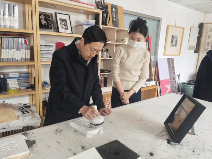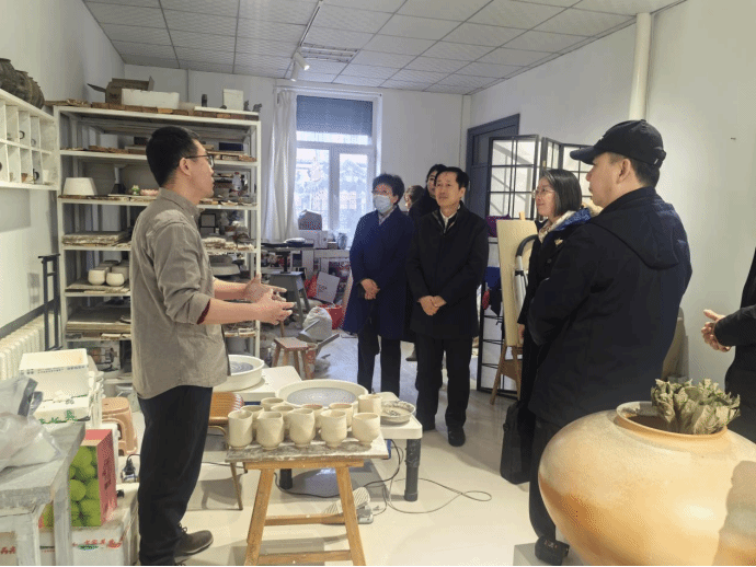 郭砾对高学昌一行人员到访表示热烈欢迎,并简要介绍我校创意设计产业园区发展建设基本情况。调研组一行观看了园区宣传片,实地走访了创意设计工作室,着重了解近两年我校创意设计产业园区在文创产品研发、影视创作、特色高温陶瓷、数字原创IP设计、艺术衍生品制作等方面开展的校企校地合作、落地产业项目情况;观看了创意设计团队摄制的中央军委征兵宣传片《明日英雄》、哈尔滨中华巴洛克历史文化街区官方宣传片《气贯中西一中华巴洛克》、哈尔滨夏季2024文旅宣传片《国强在尔滨的2024》;亲自体验了非物质文化黑龙江桦树皮剪纸、龙江书刻“冰雪拓”等创意设计成果,对学校创意设计产业项目成果转化、工作室运营、实践育人等方面取得的成效给予高度评价。