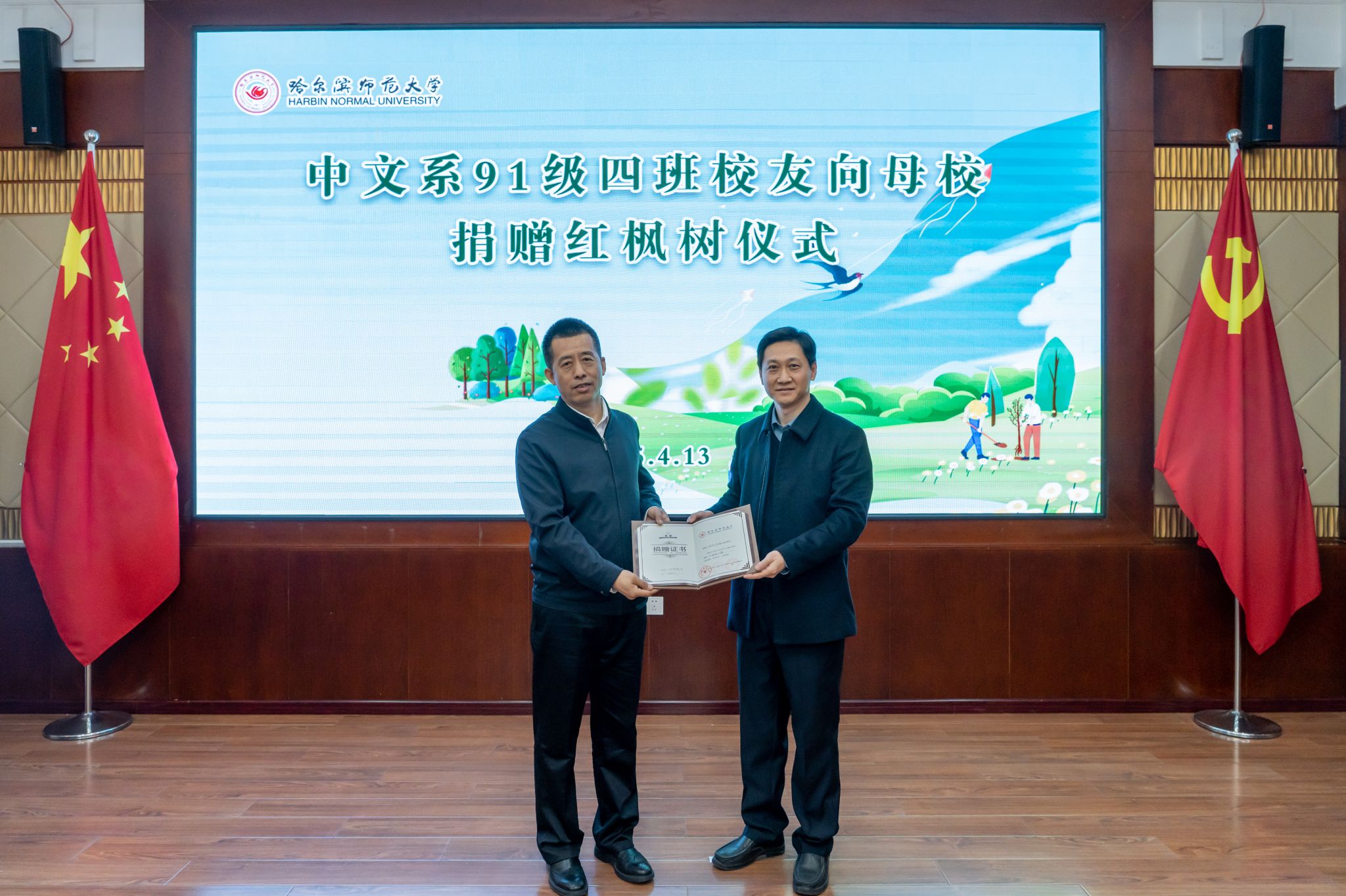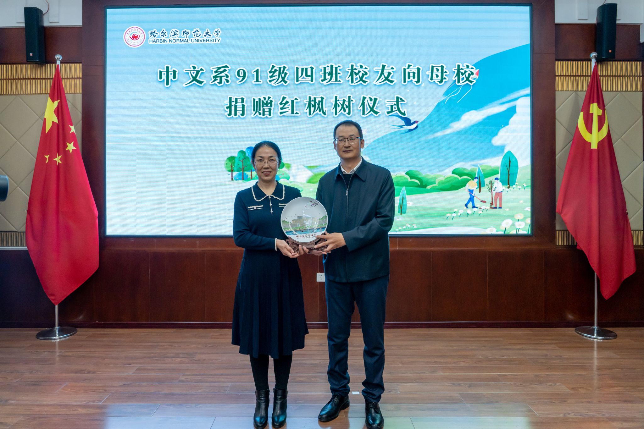 文学院党委书记刘宗波代表文学院对校友们回家表示热烈欢迎,对校友们铭记师恩、为母校播种新绿的爱心义举表示衷心感谢。他表示,红枫是“跃动着生命力的教科书”,学院将以此为契机培育更多心怀家国的栋梁之材,并诚邀各位校友常回家看看。