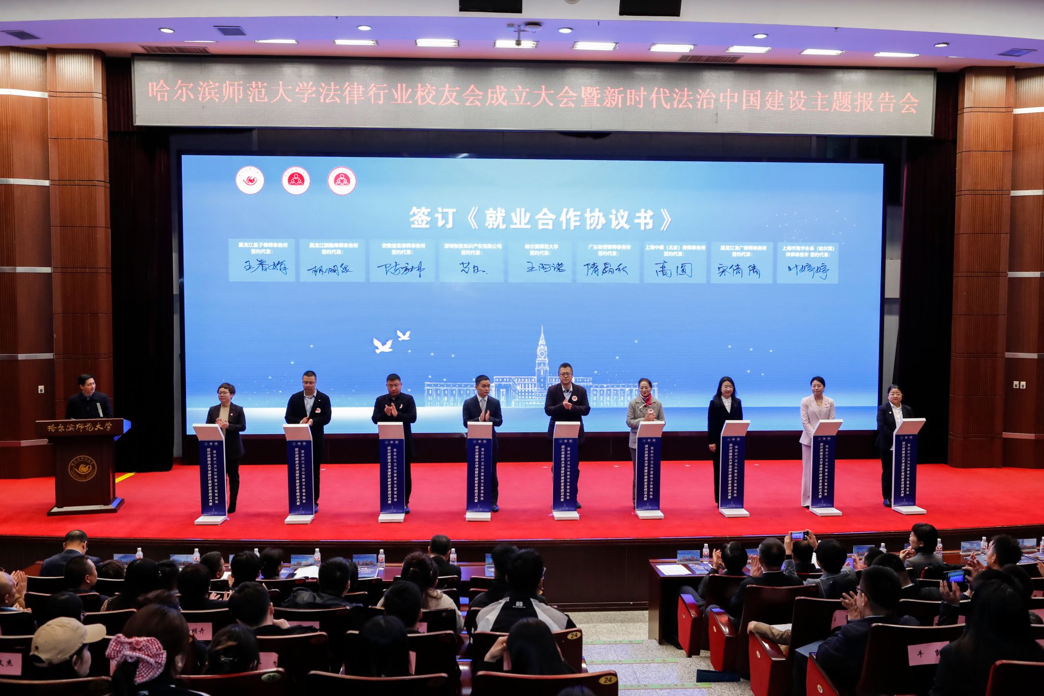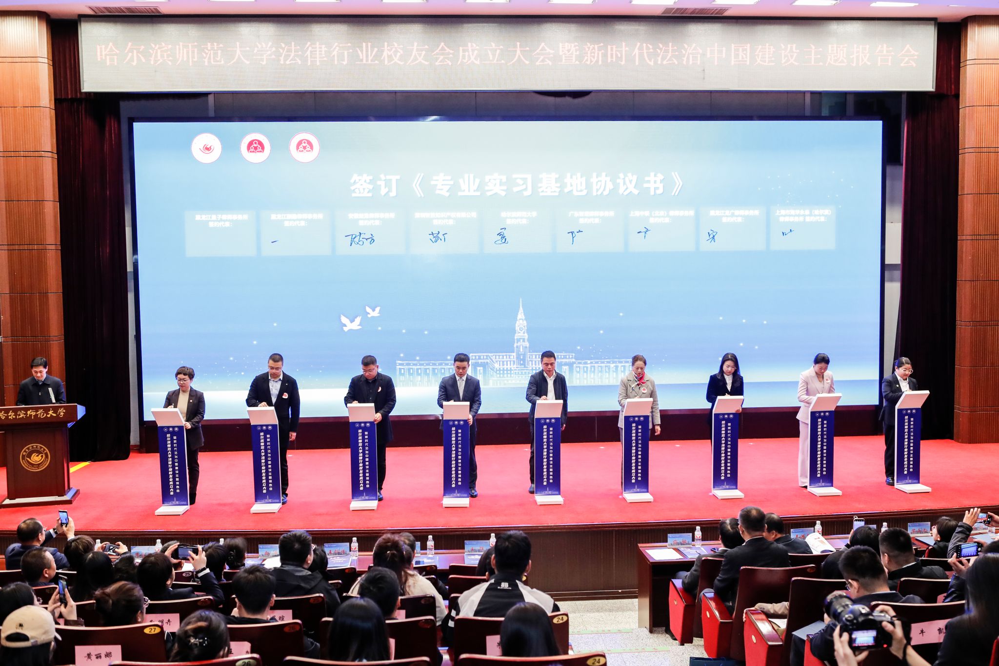 4月26日,哈尔滨师范大学法律行业校友会成立大会暨新时代法治中国建设主题报告会在科学会堂召开。校长蒋鲲,党委副书记王辉,党委常委、统战部部长、校友会秘书长宿建,党委办公室、教务处、学生就业指导处负责人,法学院相关领导、老师及学生代表,从事法律行业相关工作的校友代表共同见证大会盛况。