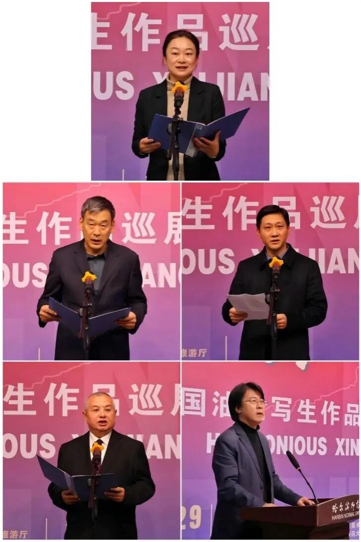 阿里甫·亚森在开幕仪式致辞并宣布展览开幕。他指出,“和美新疆”巡展已先后在深圳、上海、乌鲁木齐、斐济共和国、长春等国内外展出,产生了广泛的社会影响,让更多的人通过油画艺术之美关注新疆、了解新疆、热爱新疆。期待通过这次展览进一步升华新疆与黑龙江的深厚情谊,加强文化交往交流交融,让祖国东北、西北两地人民的心像石榴籽一样紧紧抱在一起。