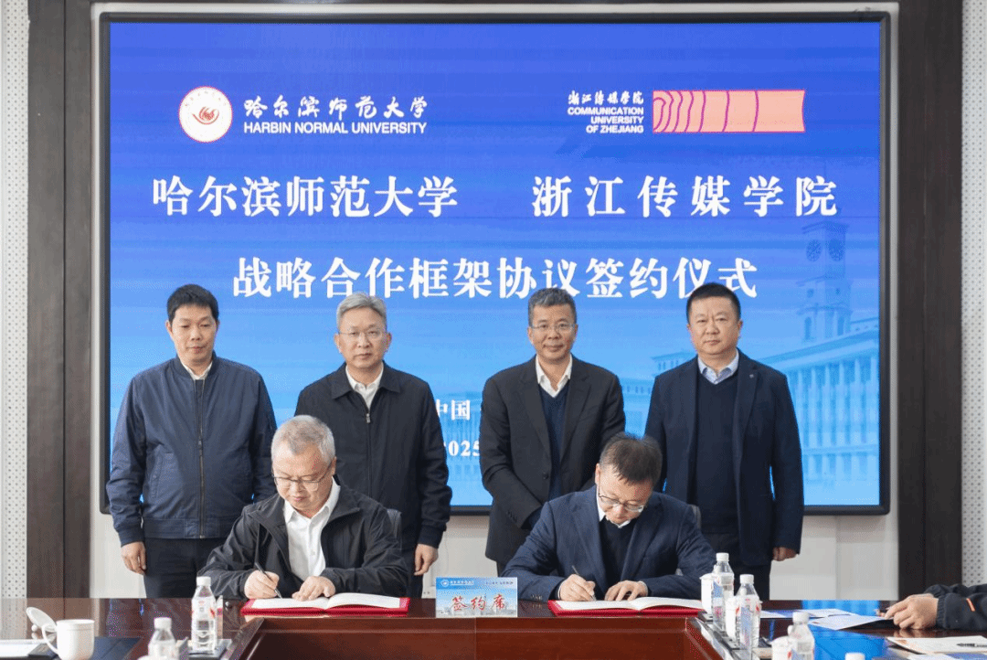 调研座谈后,李林、姚争分别代表两校签署《哈尔滨师范大学 浙江传媒学院战略合作框架协议》,孙立军、韦国潭共同见证签约时刻。