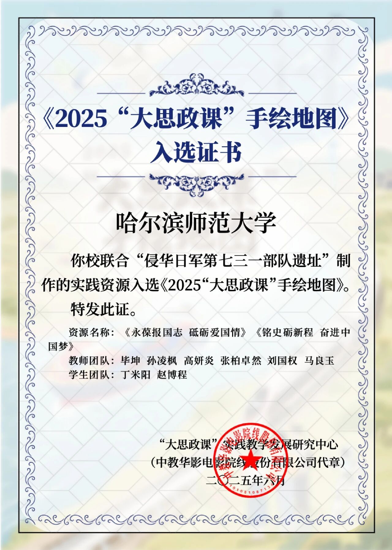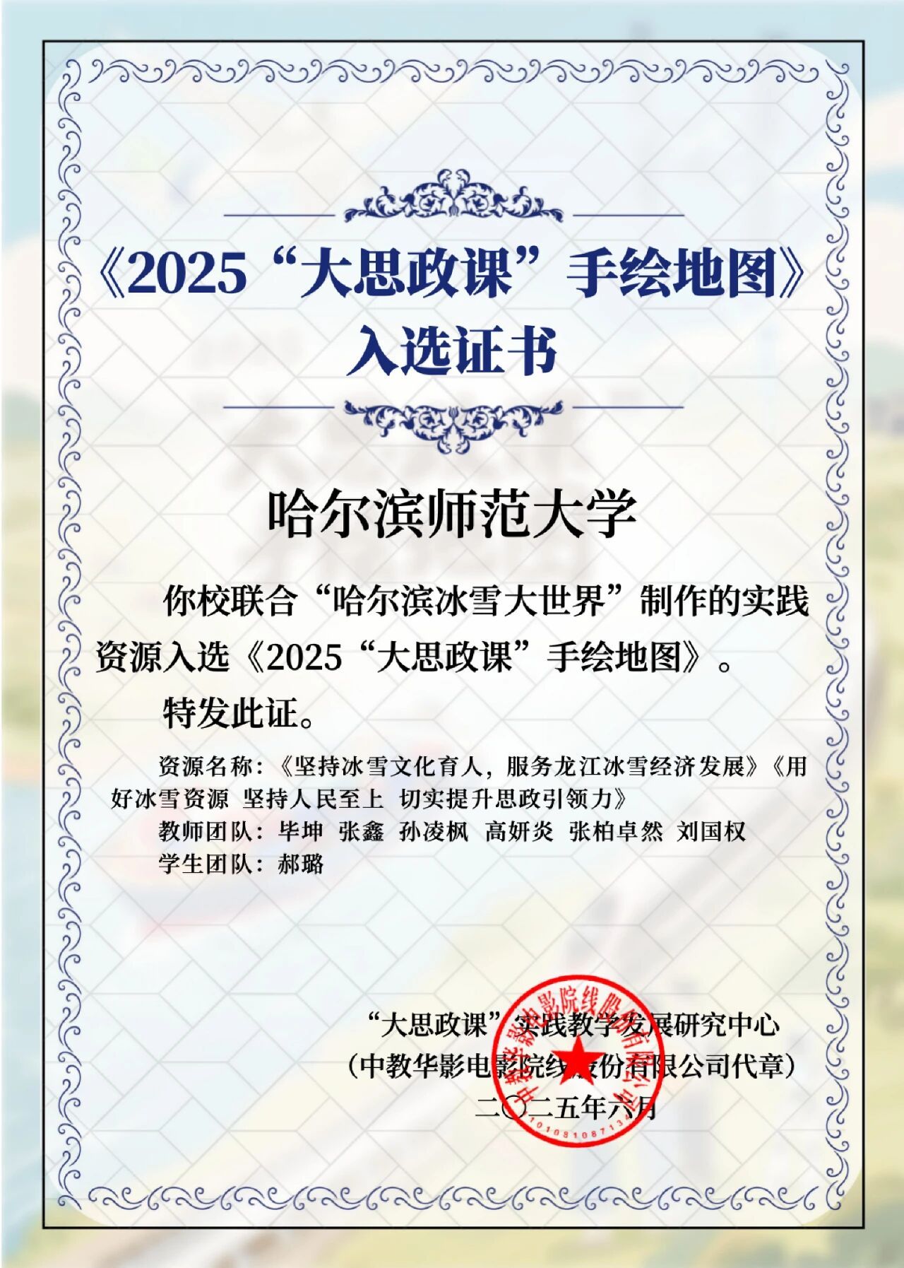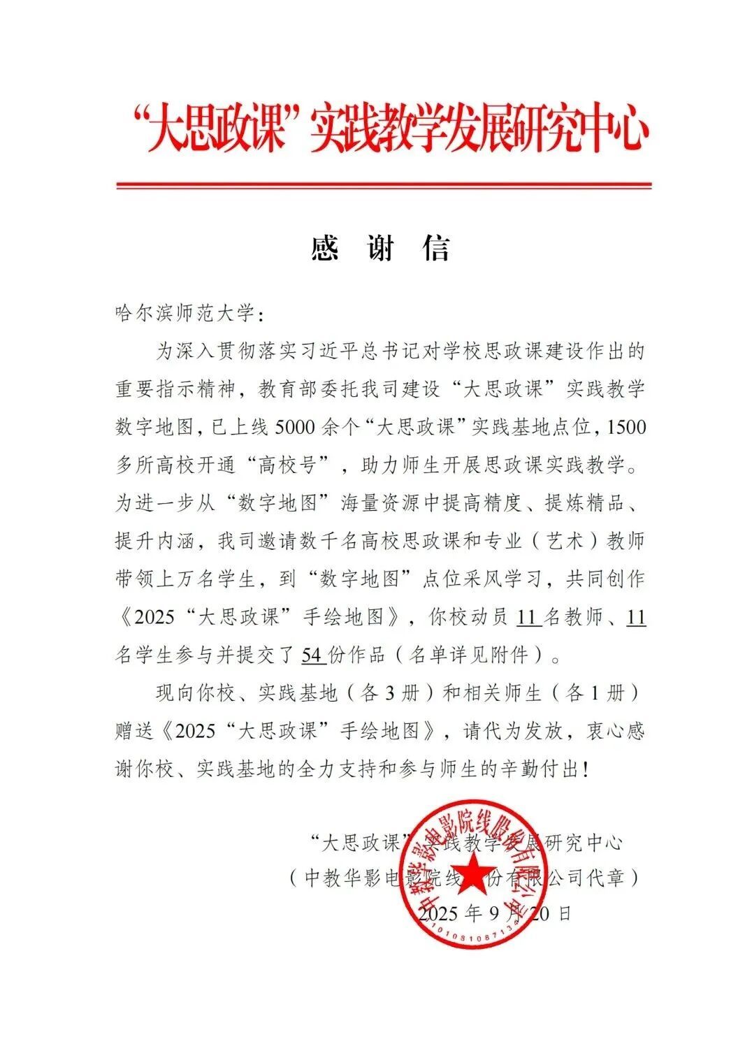 近日,教育部“大思政课”实践教学发展研究中心向我校发来感谢信,对我校在项目实施过程中作出的突出贡献给予肯定与感谢。我校制作的包括我省“大思政课”实践教学数字地图——《北国好风光 美在黑龙江》在内的8幅数字地图和4项实践资源入选《2025“大思政课”手绘地图》。