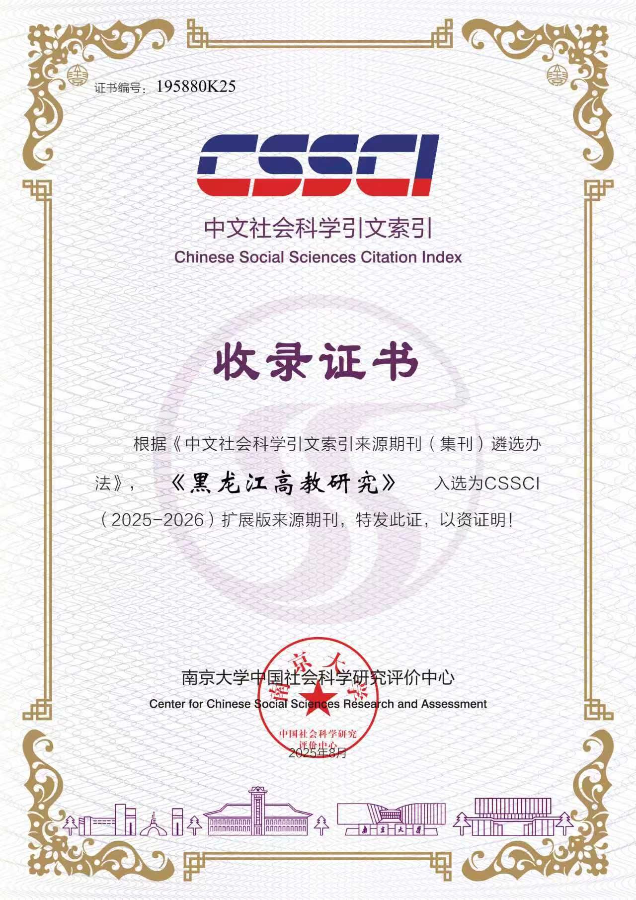近日,我校主办的《黑龙江高教研究》正式收到南京大学中国社会科学研究评价中心颁发的收录证书,凭借在高等教育领域的深厚学术积淀与广泛影响力,再度入选 CSSCI(中文社会科学引文索引)扩展版来源期刊。