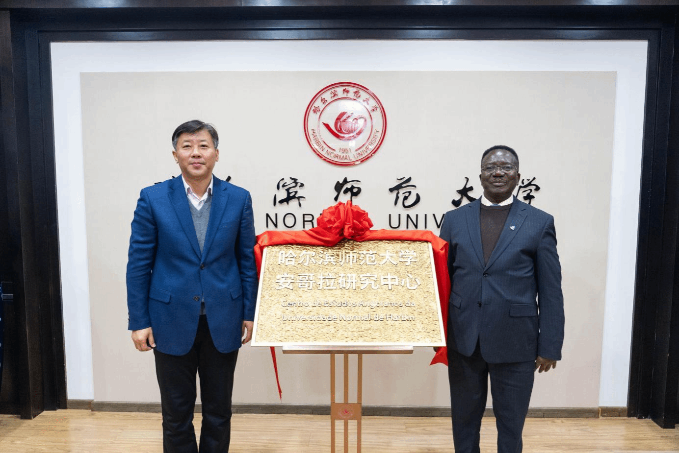 我校校长蒋鲲与安哥拉内图大学校长佩德罗共同为“哈尔滨师范大学安哥拉研究中心”揭牌,该中心是中国高校首个专注于安哥拉国别研究的学术机构,是深化中安人文交流与相互认知的重要学术平台。