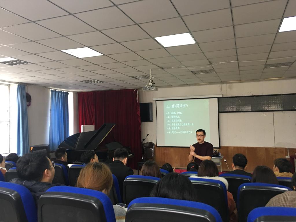 (左游/文)为了贯彻学校“112349”工作模式精神,让2019届毕业生了解当前就业市场状况、正确认知自我、熟悉就业流程等相关知识,音乐学院于10月30日在音乐楼227报告厅举办了2019届毕业生就业指导讲座。学院副处级辅导员左游担任主讲,2019届毕业生听取了讲座。