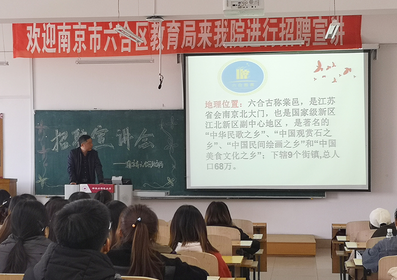 招聘会伊始,辛显文代表学院对此次南京六合区教育局一行23人来到哈尔滨师范大学教育科学学院进行专场招聘表示欢迎,并向用人单位介绍了毕业生情况。辛显文与南京六合区教育局就关于院区合作进行深入的沟通和会谈,着眼于建立长效的合作机制,表达了进一步与招聘单位加强后续沟通与合作的希望。随后,南京六合区教育局人事科科长马恩明在社科楼352教室进行招聘宣讲。马恩明从招聘意向,待遇条件、发展前景等方面向同学们介绍了南京六合区教育局的基本情况。马恩明表示此次校园招聘所设岗位是专门面向学前教育毕业生的,后续岗位将会面向全体中小学教师专业毕业生,南京六合区教育局也会为大家提供丰厚的岗位福利。随后,马恩明从选择城市,选择行业,选择单位三方面为同学们分享了自己的经验,他认为在二线城市既可以拓宽视野,提升能力,同时也可以事半功倍地选择适合自己的就业岗位,获得正循环。在选择单位方面,他表示在教育局有完善的体系,竞争机会多,私立学校压力大、挑战大,可供选择的余地较小。最后,马恩明就同学们的提出的问题进行解答。