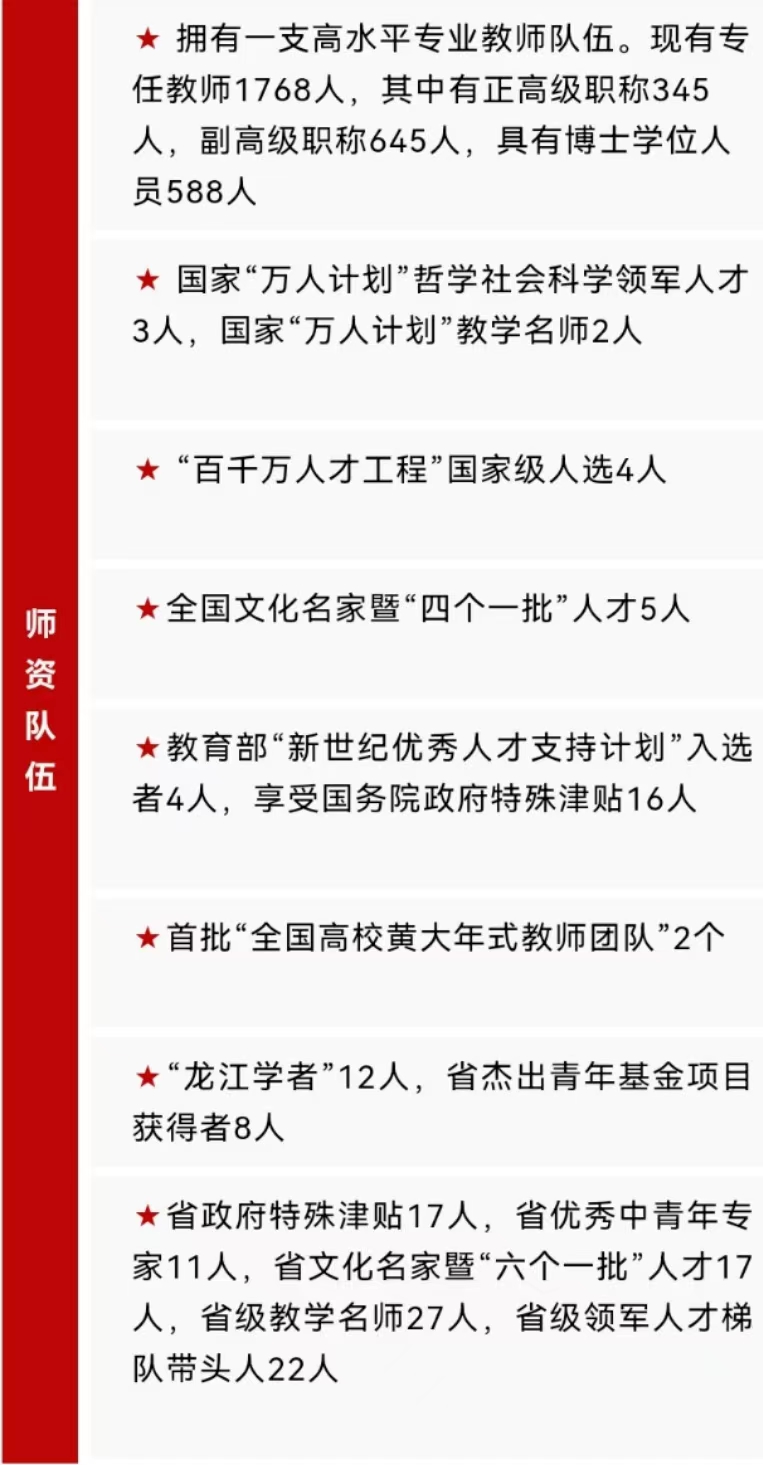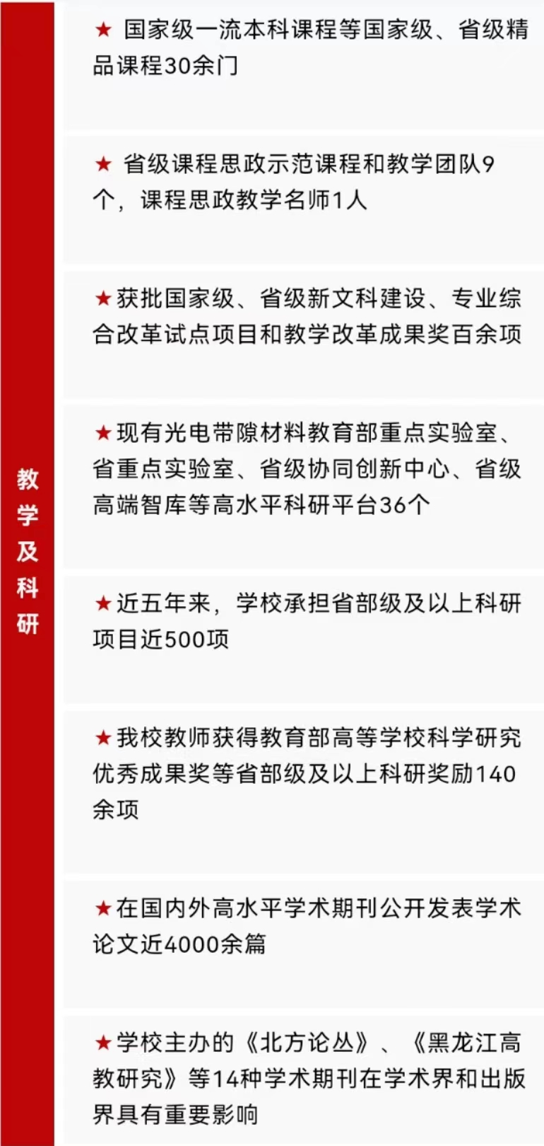 学校坚持教育教学工作中心地位,突出教师教育特色,不断深化教育教学改革,三次入选教育部“卓越教师培养计划”改革项目,获批黑龙江省高等学校课程思政建设示范高校、黑龙江省高等学校课程思政教学研究示范中心。现有国家级教学团队、国家级实验教学示范中心、国家级虚拟教研室建设点和国家级人才培养模式创新实验区等国家级重点人才培养支持计划。