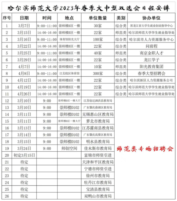 另附:哈尔滨师范大学2023年春季学期大中型双选会日程安排