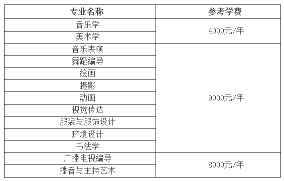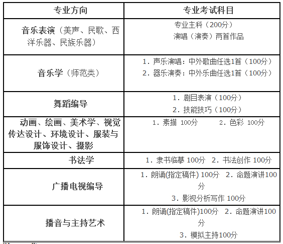 音乐表演(美声、民歌、西洋乐器、民族乐器)、音乐学(师范类)、舞蹈编导、动画、绘画、美术学(师范类)、书法学、视觉传达设计、环境设计、服装与服饰设计、摄影、广播电视编导、播音与主持艺术等专业及专业方向。以上专业均文理兼招。