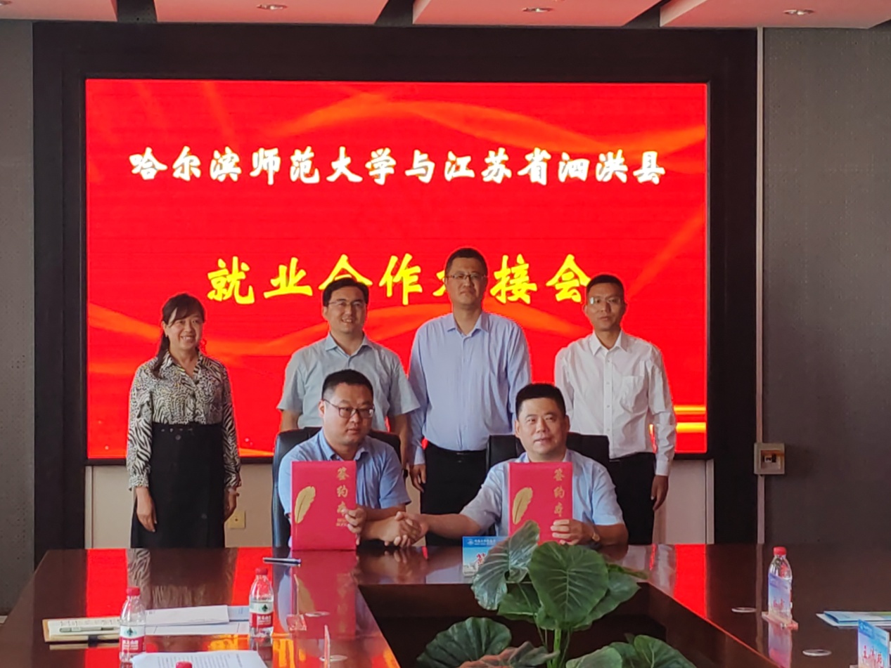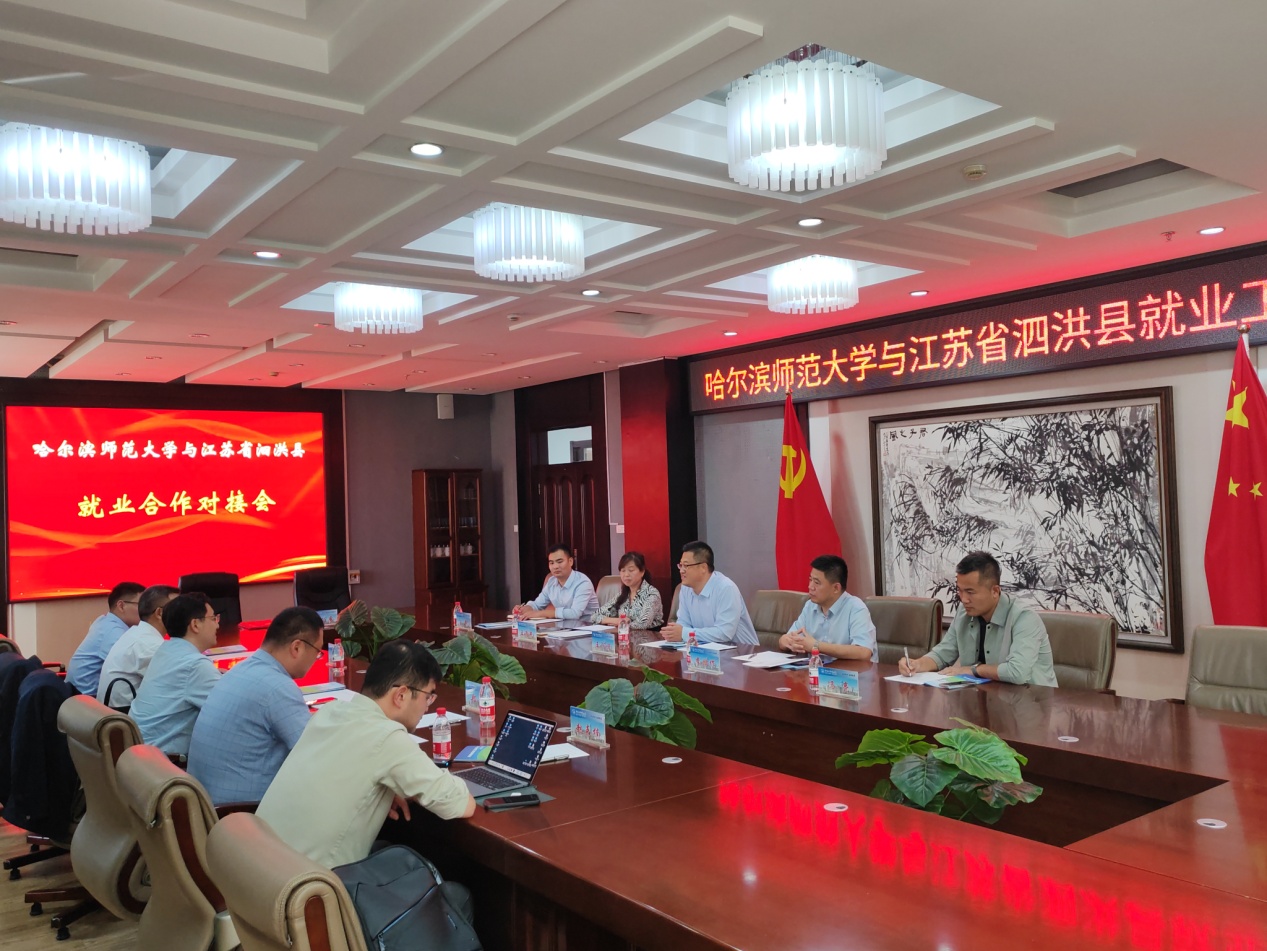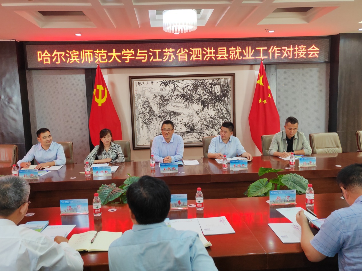 庄韦介绍泗洪县基本情况。庄韦说,泗洪紧邻洪泽湖,水系发达,自然环境优良,旅游资源丰富,是苏北地区著名的“鱼米之乡”,常驻人口100万左右,工业方面以机电装备、绿色食品、高端纺织、光伏新能源、绿色家居、新材料产业为主导,各领域人才需求量较大。近年来与哈师大的人才工作呈现“引的来、留的住、用的好”的良好态势,教育系统引进的280余名教师为县域教育事业发展发挥的重要作用。未来,希望在更多的专业领域加强校地合作,让更多优秀学子服务泗洪经济建设。