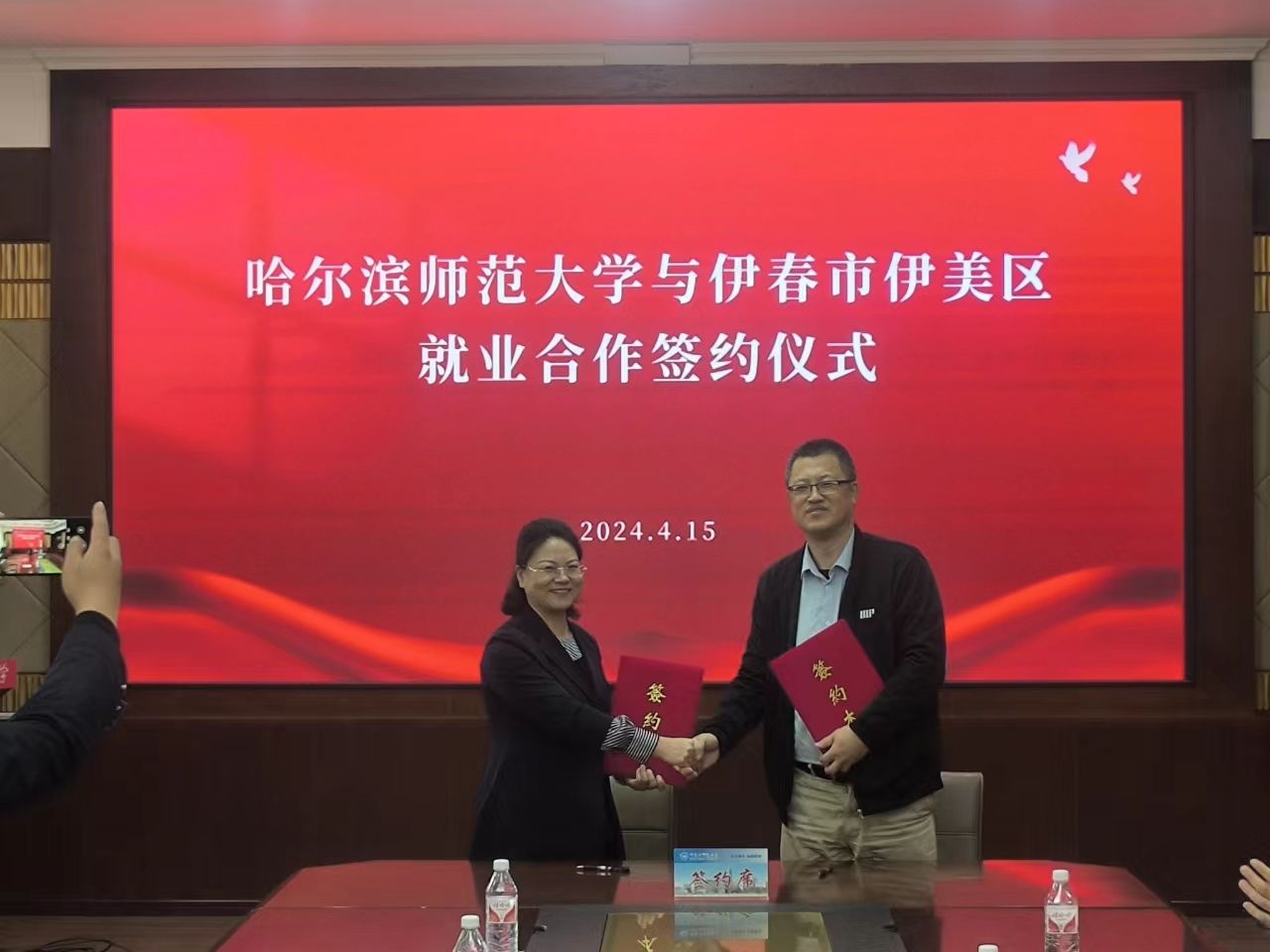 会后,王阿诺与宫媛媛签订《哈尔滨师范大学与伊春市伊美区就业合作协议》。