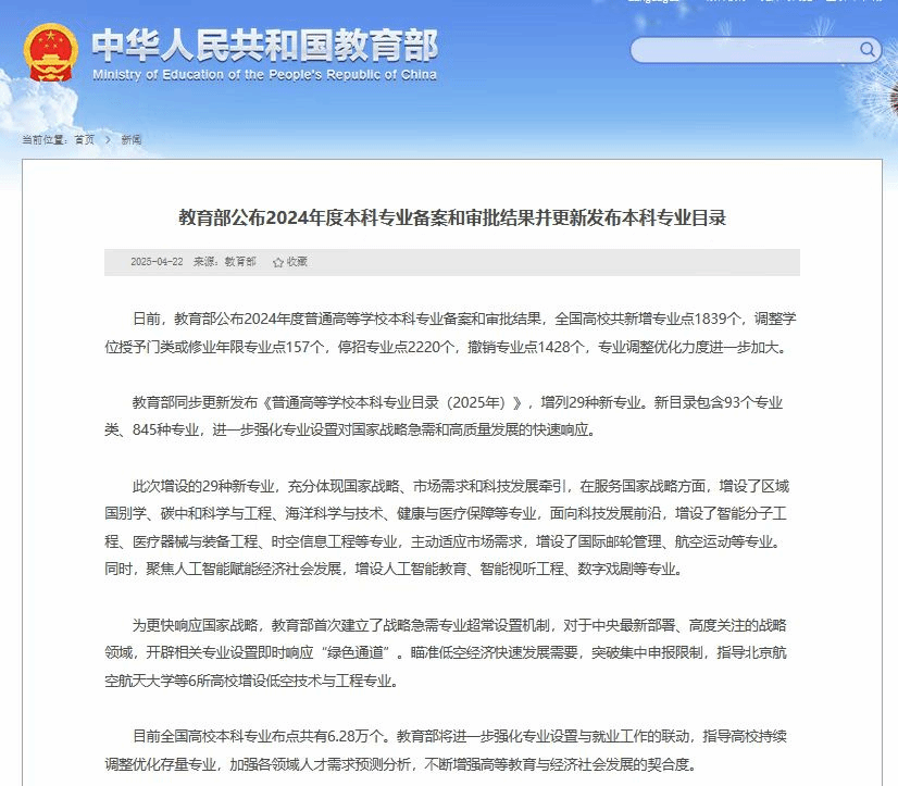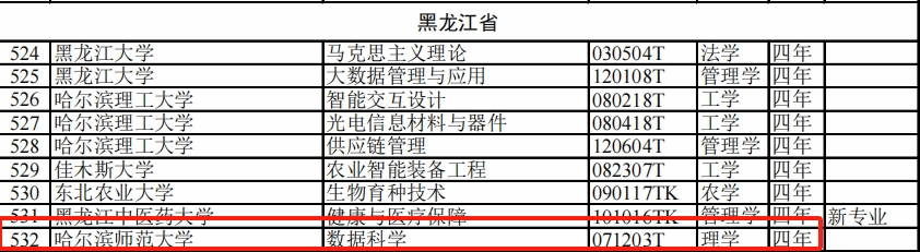 2025年4月22日,国家教育部公布的《教育部公布2024年度本科专业备案和审批结果并更新发布本科专业目录》中,哈尔滨师范大学数学科学学院申报的本科专业——数据科学专业(代码:071203T)获批通过。