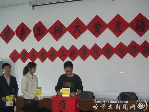 4月20日中午,斯拉夫语学院举行“爱无疆,共担当”为青海玉树地震灾区捐款仪式。全院学生为地震灾区死难同胞默哀一分钟后,学生代表向全体学生发出捐赠倡议。学生们积极踊跃地献出自己的爱心,并表示一个人的力量可能非常渺小、微不足道,但只要万众一心,伸出援助之手,灾区人民必将战胜震魔,重建家园,重拾美好生活!当晚黑龙江电视台《新闻联播》对这次捐款活动进行了报道。4月21日下午,政法学院在松北及呼兰两个校区同时举行了主题为“情系玉树,大爱无疆”向青海玉树地震遇难同胞默哀及捐款仪式。广大学生希望这些饱含着爱心的捐款,能够给灾难中的同胞带去废墟中重建家园的勇气和力量。当天,物理与电子工程学院也在学院大厅设立了捐款箱,有80余名教职工为灾区积极踊跃慷慨解囊,奉献爱心。与此同时,学院广大学生也积极参与到这次向灾区捐款的活动中来,共同帮助灾区人民渡过难关。