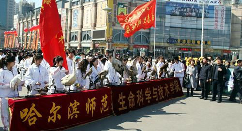 为普及爱鸟知识,提高爱鸟护鸟意识,生命科学与技术学院与省林业厅、省野生动物保护协会、共青团东北林业大学委员会等单位于4月24日在哈尔滨防洪纪念塔共同举办了以“科学爱鸟护鸟,保护物种多样性”为主题的黑龙江省第29届“爱鸟周”活动启动仪式。参加本次活动的有省市野生动物有关保护单位及领导,我校生命科学与技术学院赵文阁院长、杨宝君副书记及学院部分师生。
